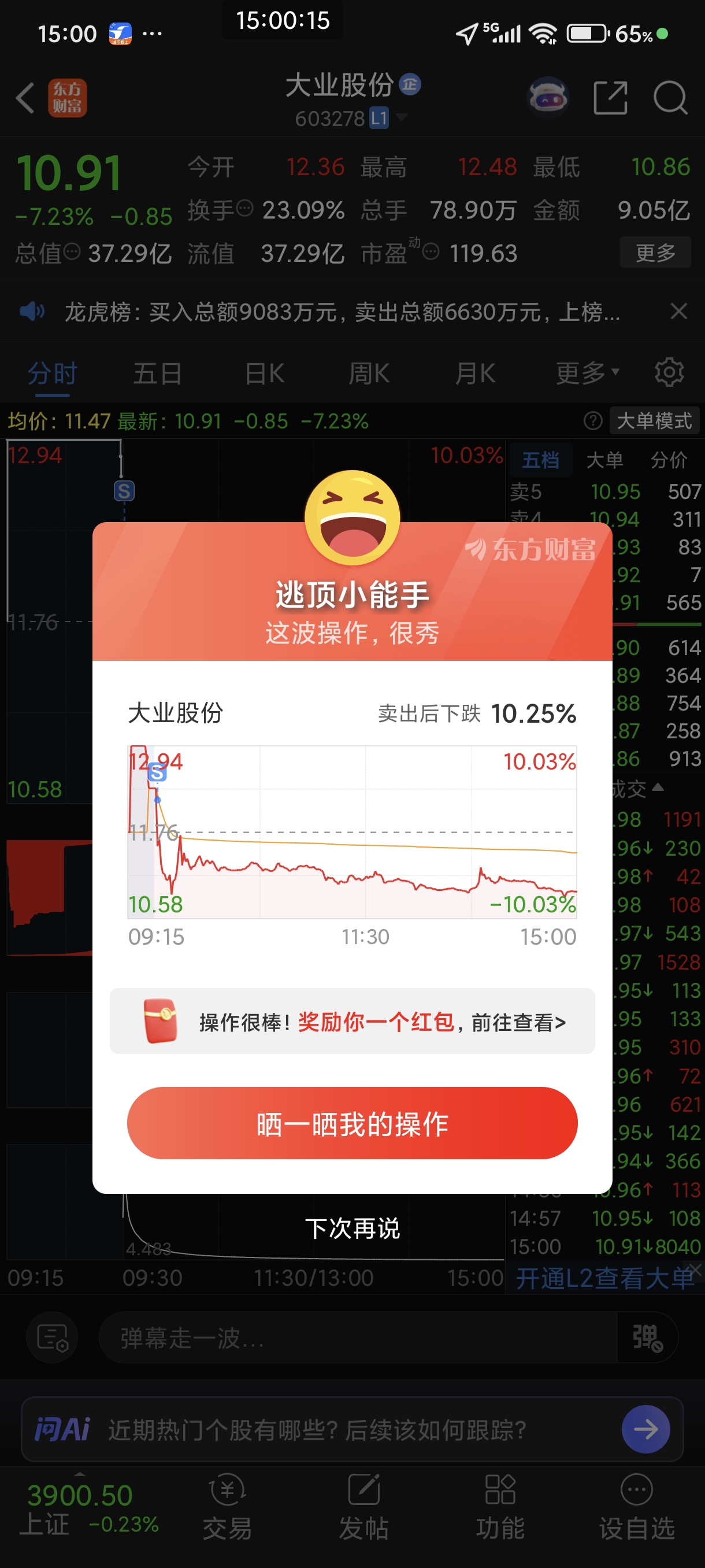 $大业股份(SH603278)$ 今天东方财富表扬了我