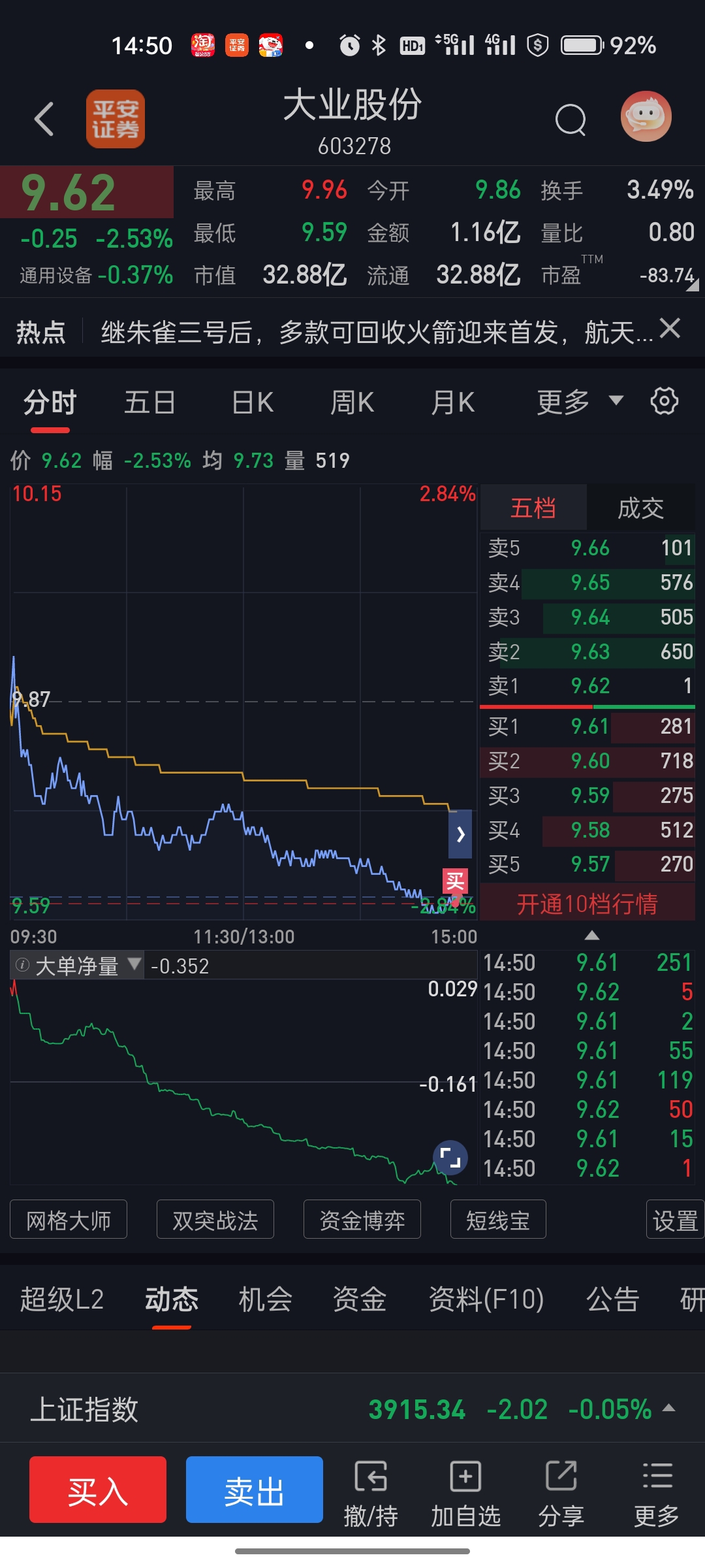 $大业股份(SH603278)$ #炒股日记# #复盘记录# #股市怎么看# #实盘记录# #投资干货# 大业股份,今天回调到五日均线附近是很好上车机会,粉丝们可以等到明天找低位看看