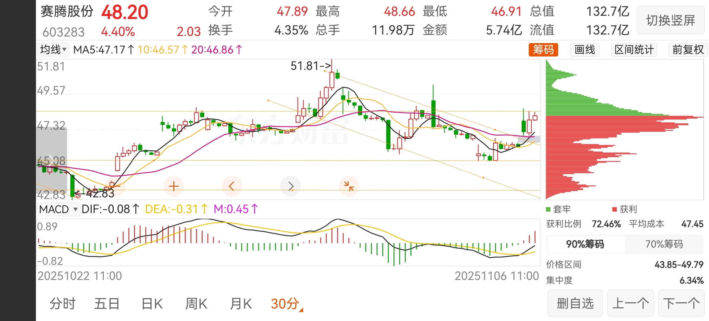 $赛腾股份(SH603283)$ 30分线到了压力位,冲过去就牛X了,加油。