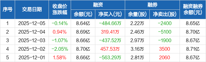 赛腾股份:融资净偿还484.66万元,融资余额8.64亿元(12-05)