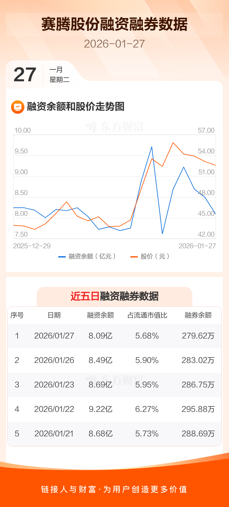 交易所最新数据显示,赛腾股份于2026年1月27日获融资买入1.05亿元,融资偿还1.45亿元,当日融资净偿还4006.07万元。目前,该股融资余额8.09亿,占流通市值比例为5.68%。