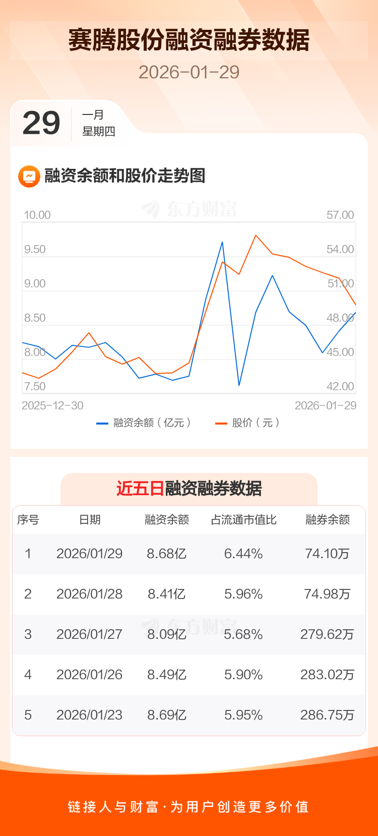 交易所最新数据显示,赛腾股份于2026年1月29日获融资买入1.38亿元,融资偿还1.11亿元,当日融资净买入2686.46万元。目前,该股融资余额8.68亿,占流通市值比例为6.44%。