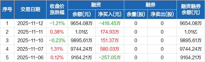 键邦股份:融资净偿还416.45万元,融资余额9654.08万元(11-12)