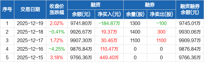 键邦股份:融资净偿还184.87万元,融资余额9741.8万元(12-19)