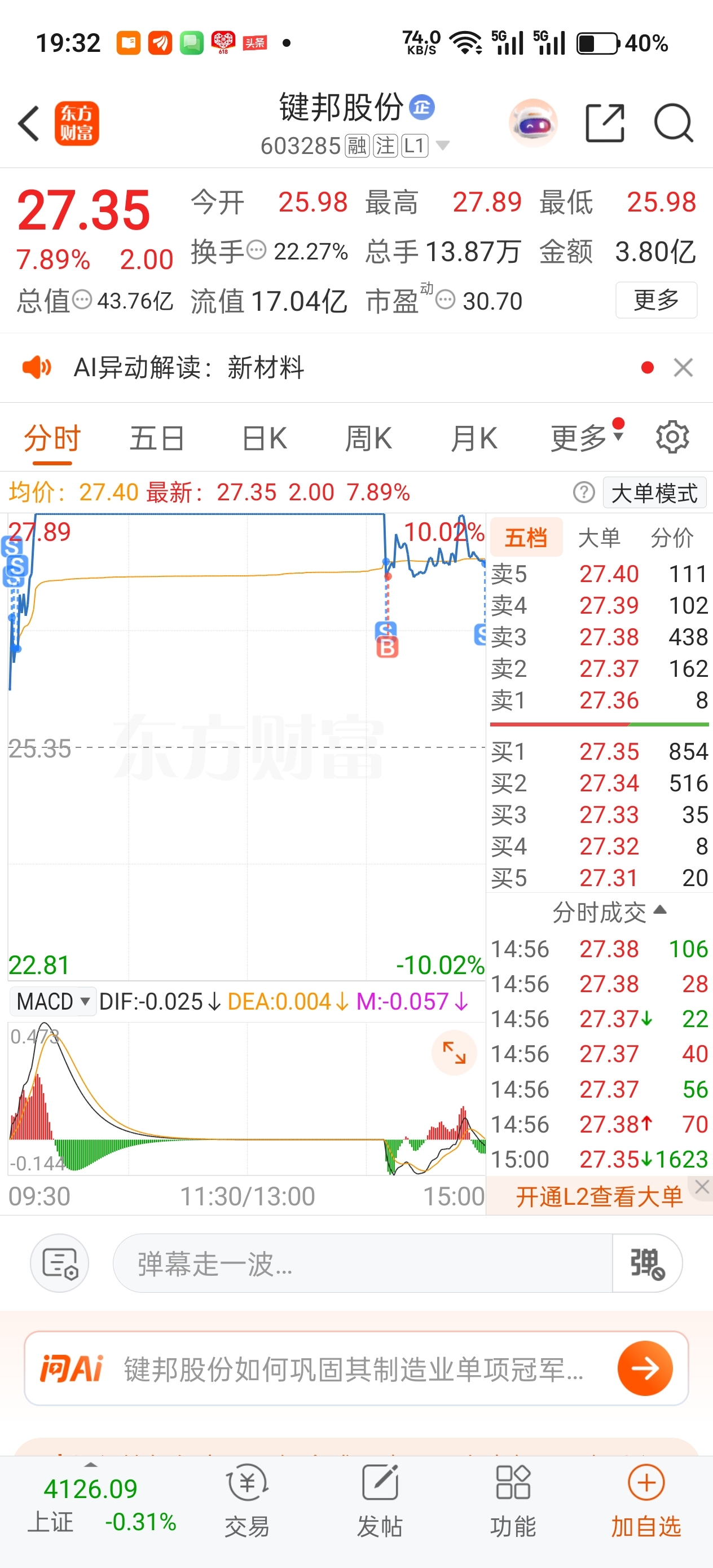 $键邦股份(SH603285)$ 今天没涨停,我生气了主力,1100都卖的剩500了,6块的成本,估计比你低多了,之前持仓还打马晒克,今天不用了,因为中科金财和你都基本清的差不多了,今天又闲的没事,借钱买了长安,这票股价发出去也影响不到他的走势,出了名的拉几,前天拿你800股,你要争气也不捡漏,你怎么就今天发力了。