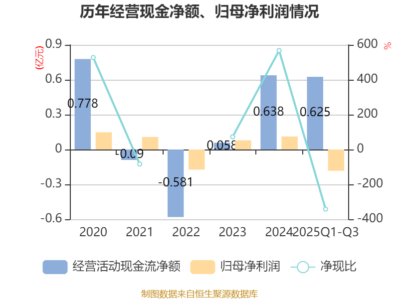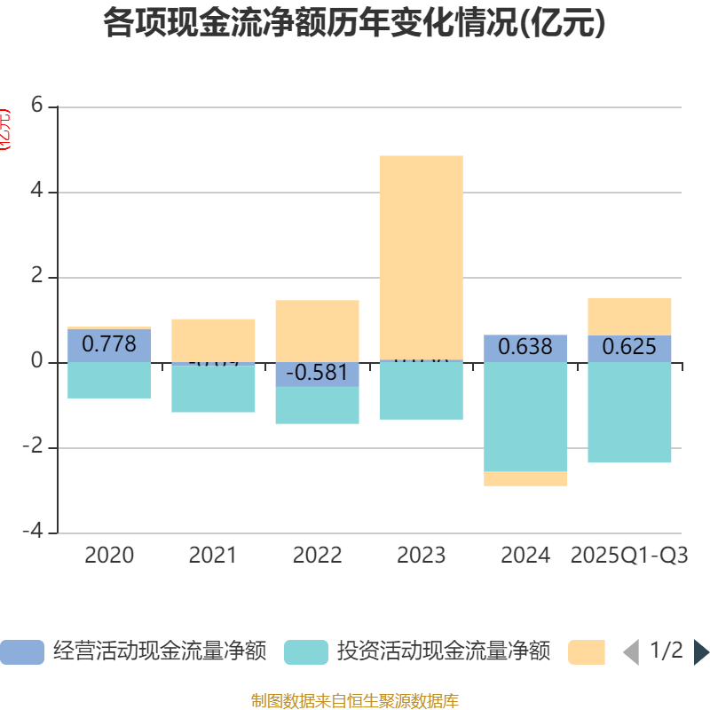 2025年前三季度,公司经营活动现金流净额为6253.11万元,同比增长93.66%;筹资活动现金流净额8768.8万元,同比增加8595.51万元;投资活动现金流净额-2.36亿元,上年同期为-1.08亿元。