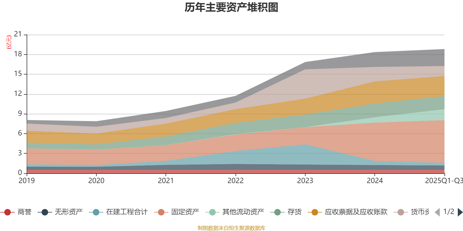 资产重大变化方面,截至2025年三季度末,公司其他流动资产较上年末增加102.59%,占公司总资产比重上升4.34个百分点;货币资金较上年末减少30.77%,占公司总资产比重下降3.86个百分点;固定资产较上年末增加11.49%,占公司总资产比重上升2.78个百分点;应收票据及应收账款较上年末减少9.09%,占公司总资产比重下降2.06个百分点。