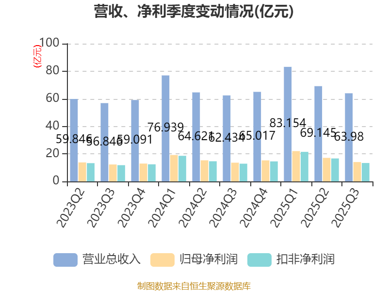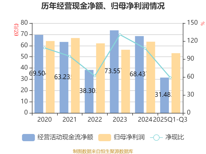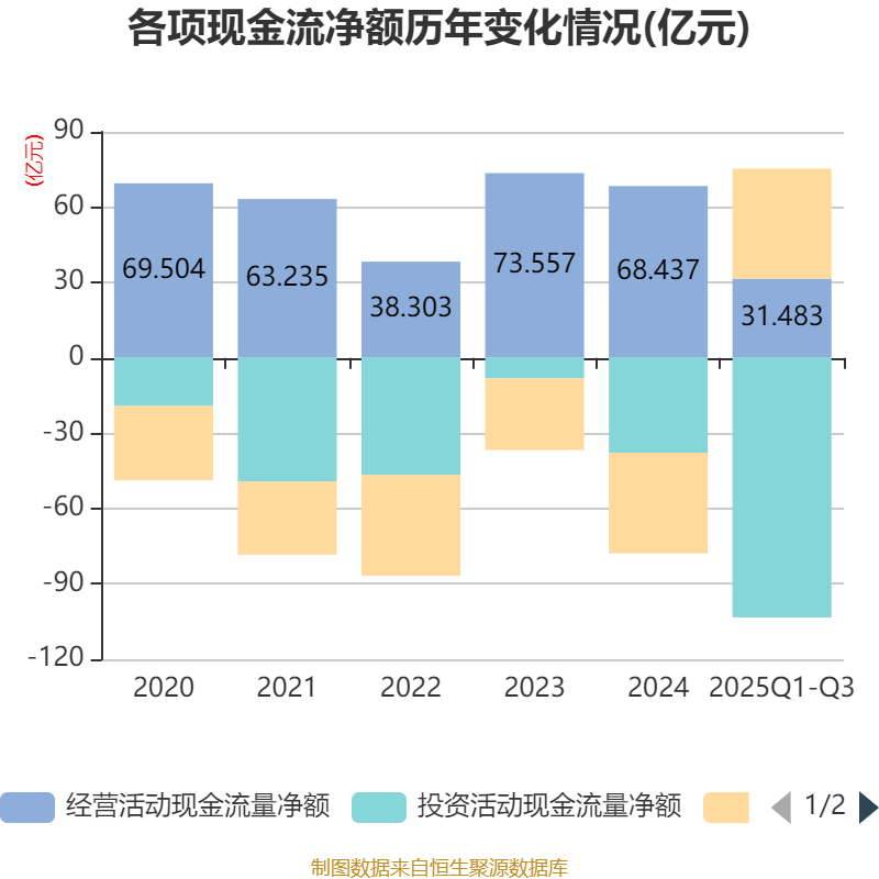 2025年前三季度,公司经营活动现金流净额为31.48亿元,同比增长14.38%;筹资活动现金流净额43.88亿元,同比增加83.57亿元;投资活动现金流净额-103.35亿元,上年同期为-47.7亿元。