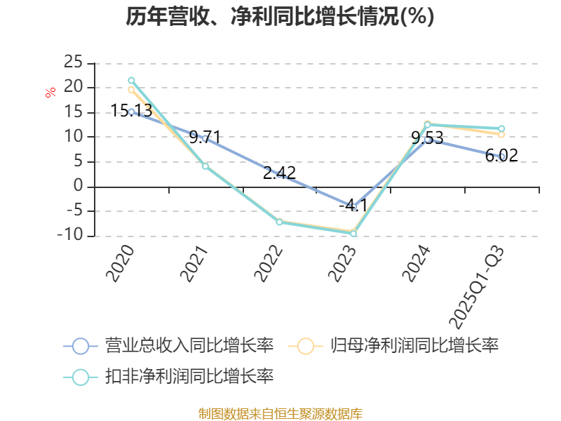 中证智能财讯海天味业(603288)10月29日披露2025年第三季度报告。前三季度公司实现营业总收入216.28亿元,同比增长6.02%;归母净利润53.22亿元,同比增长10.54%;扣非净利润51.55亿元,同比增长11.72%;经营活动产生的现金流量净额为31.48亿元,同比增长14.38%;报告期内,海天味业基本每股收益为0.94元,加权平均净资产收益率为15.46%。