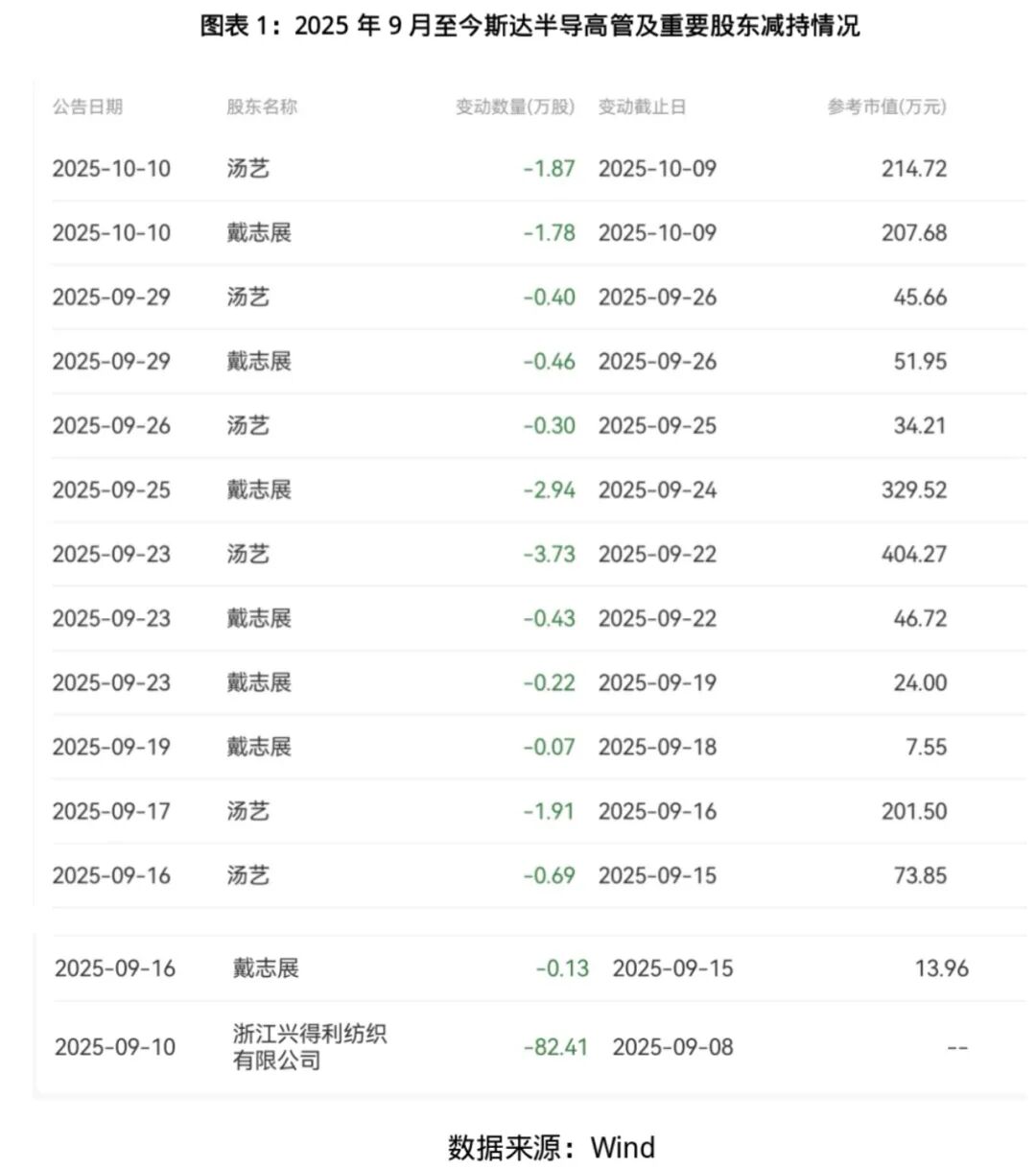 值得关注的是,2025年半年报披露后,斯达半导的两名副总经理汤艺和戴志展在9—10月初开启密集减持动作,累计套现约1655万元。