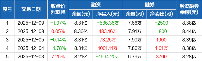 融资方面,当日融资买入3012.26万元,融资偿还3548.63万元,融资净偿还536.36万元。融券方面,融券卖出500股,融券偿还3000股,融券余量7.66万股,融券余额751.06万元。融资融券余额合计8.38亿元。