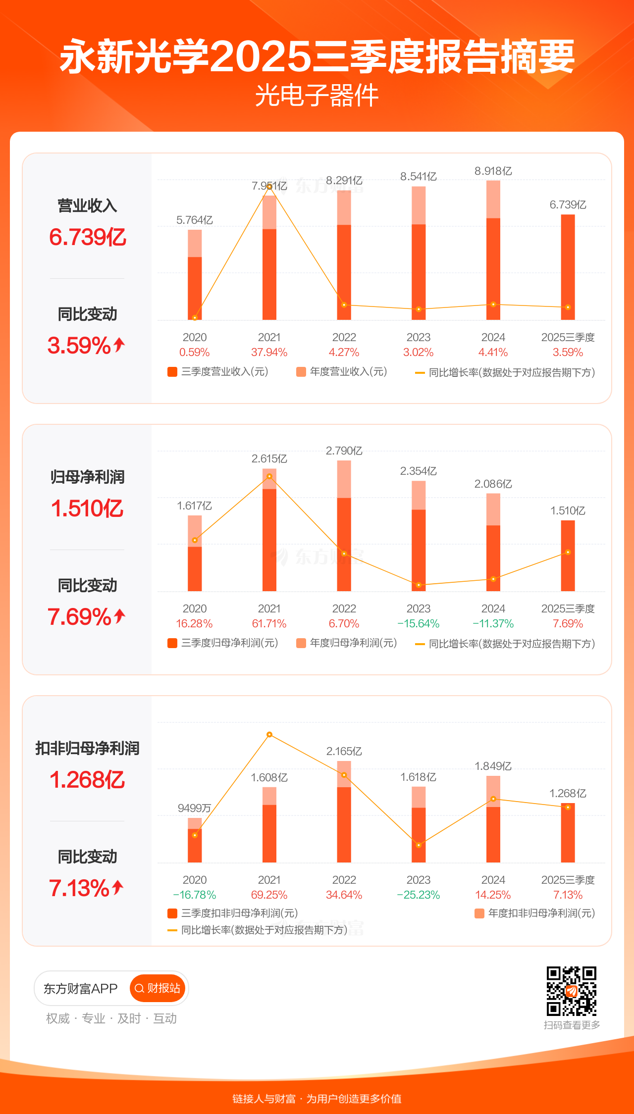永新光学10月30日发布2025年三季报显示,公司前三季实现营业收入6.74亿元,同比增长3.59%;归母净利润1.51亿元,同比增长7.69%;扣非归母净利润1.27亿元,同比增长7.13%。