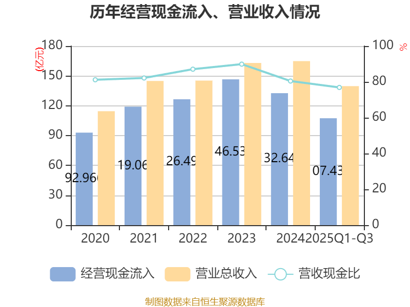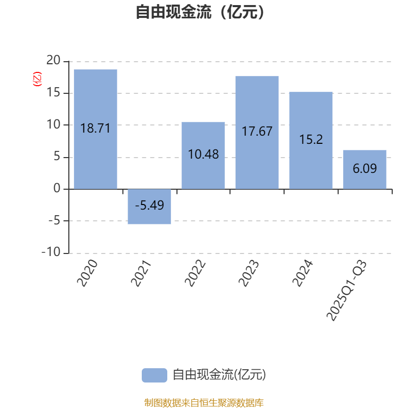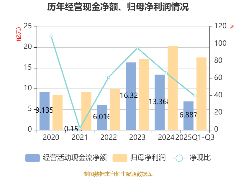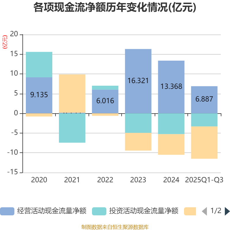 2025年前三季度,公司经营活动现金流净额为6.89亿元,同比增长6.52%;筹资活动现金流净额-8.19亿元,同比增加9990.56万元;投资活动现金流净额-3.32亿元,上年同期为-1.73亿元。