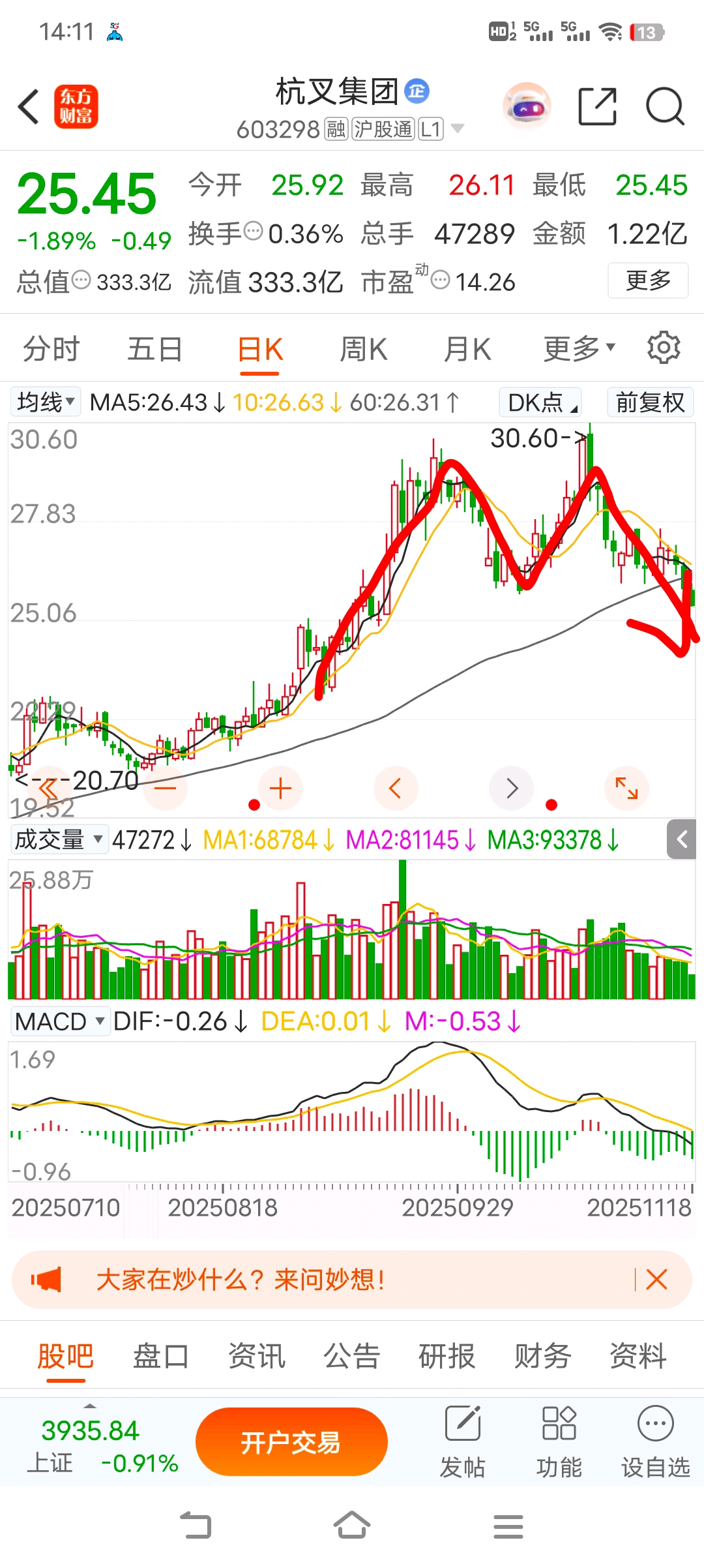 $杭叉集团(SH603298)$ M顶已成,要走长期下坡路了吧!割肉!