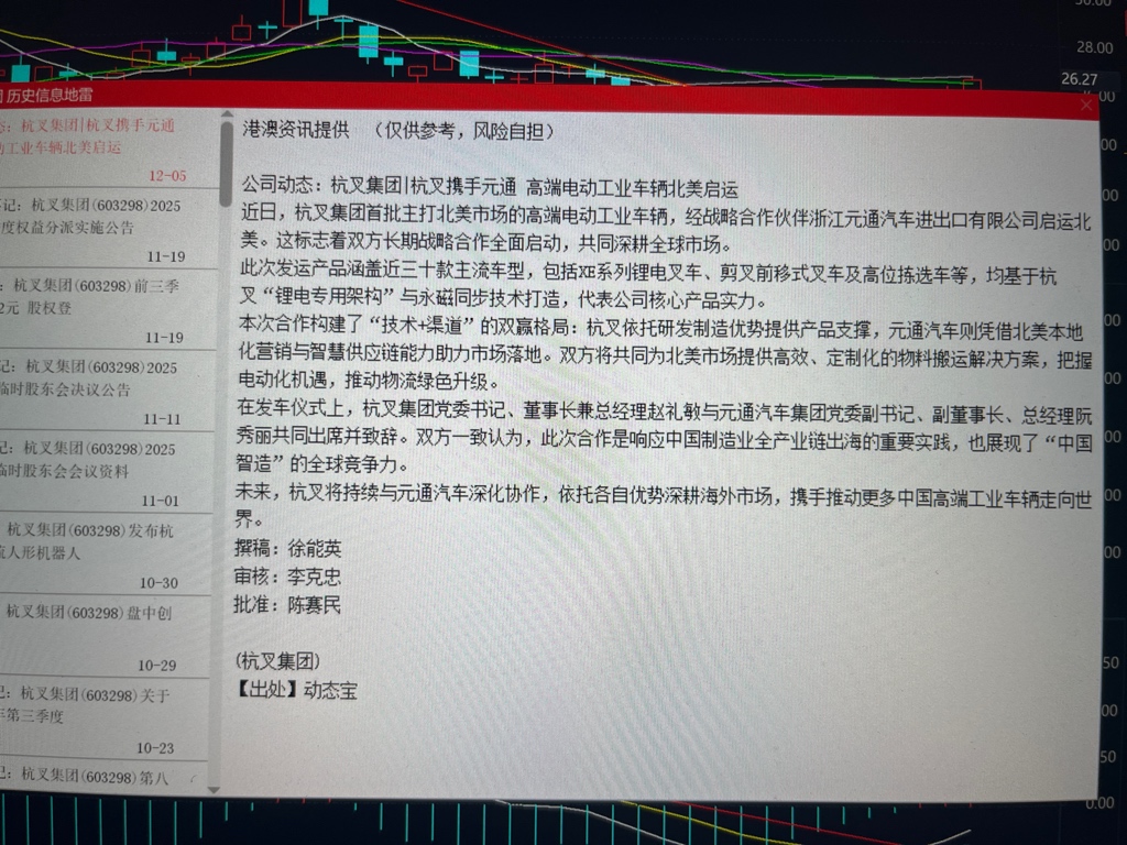 $杭叉集团(SH603298)$ 这股下周一涨到27元以上应有希望,到时候择机先出,换手率实在太低了。