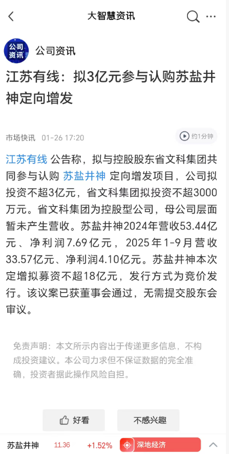 江苏有线:拟3亿元参与认购苏盐井神定向增发