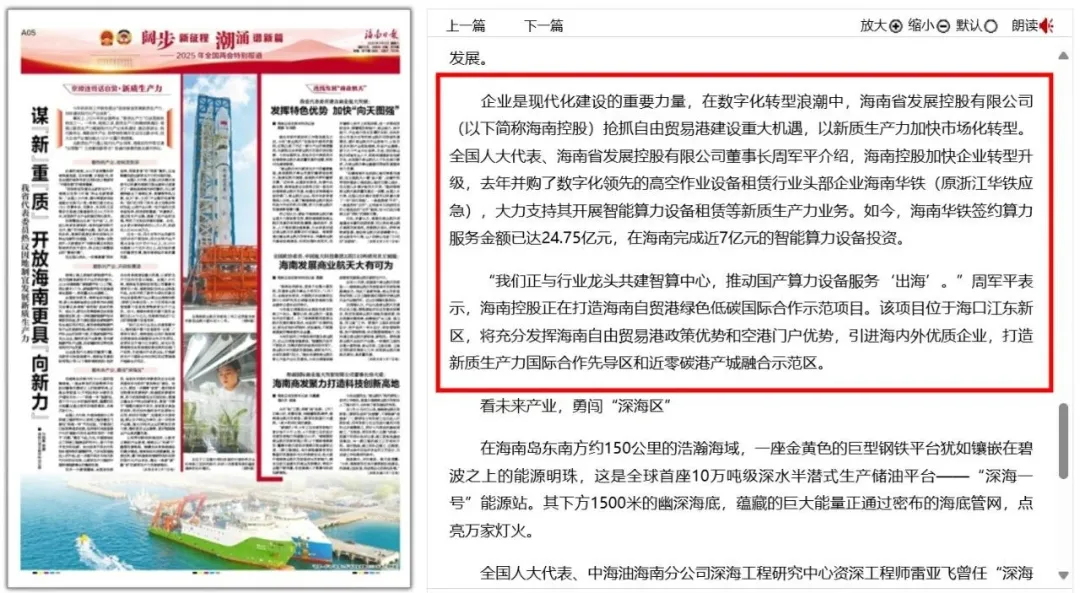 企业是现代化建设的重要力量,在数字化转型浪潮中,海南省发展控股有限公司(以下简称海南控股)抢抓自由贸易港建设重大机遇,以新质生产力加快市场化转型。全国人大代表、海南省发展控股有限公司董事长周军平介绍,海南控股加快企业转型升级,去年并购了数字化领先的高空作业设备租赁行业头部企业海南华铁(原浙江华铁应急),大力支持其开展智能算力设备租赁等新质生产力业务。如今,海南华铁签约算力服务金额已达24.75亿元,在海南完成近7亿元的智能算力设备投资。(最新数据:海南华铁签约算力服务金额已达64.35亿元,在海南完成超8亿元的智能算力设备投资。)