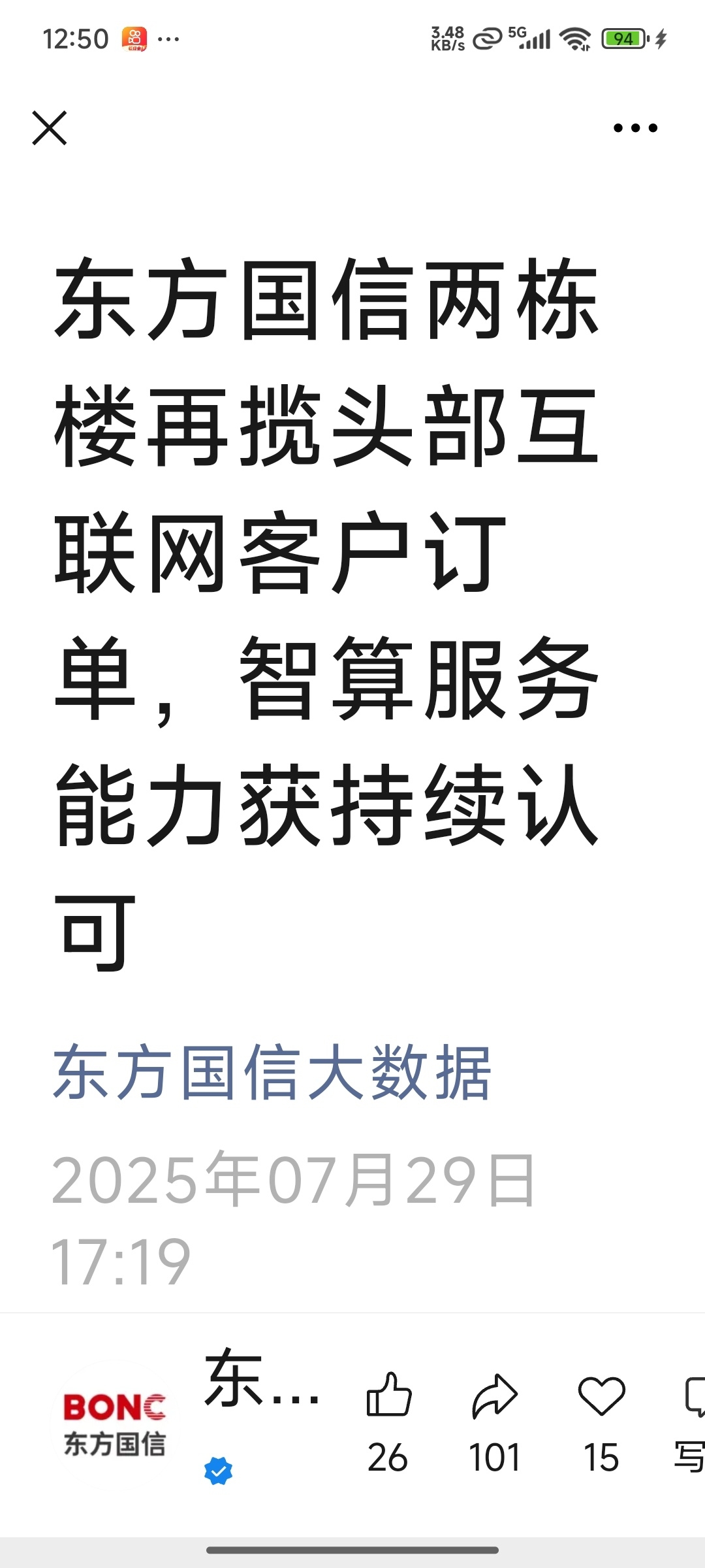 (公司官微25年7月29日发布 )东方国信一一再揽头部互联网客户(字节跳动?)算力订单,智算服务能力获持续认可!