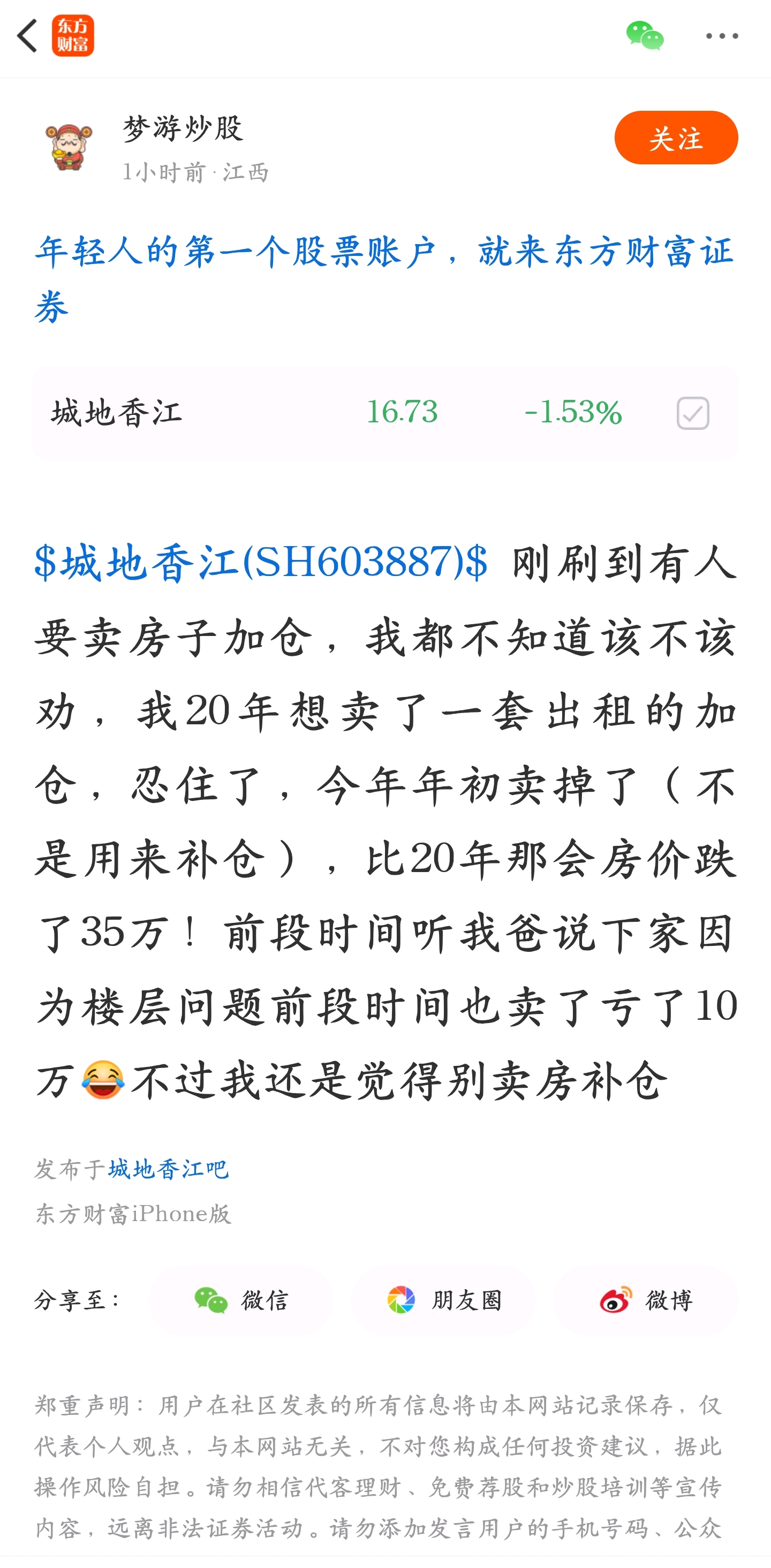 $海南华铁(SH603300)$ 给大家说一只招笑股$城地香江(SH603887)$ 跟华铁一样散户进了三倍,现在同样阴跌,吧里面的托话术跟华铁当初的如出一辙,引导别人房子贬值不如卖出补仓,笑死人了,人家就算卖了,难道不会去绩优股还去这种财务造假的股里面吗?