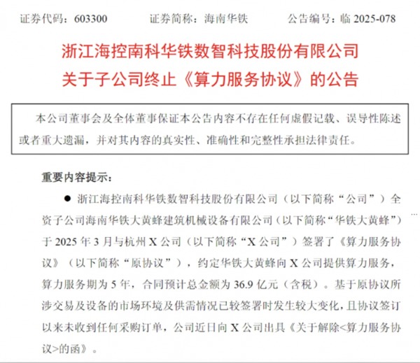 9月30日晚,海南华铁(603300)发布公告称,其全资子公司海南华铁大黄蜂建筑机械设备有限公司与杭州X公司签署的《算力服务协议》正式终止。