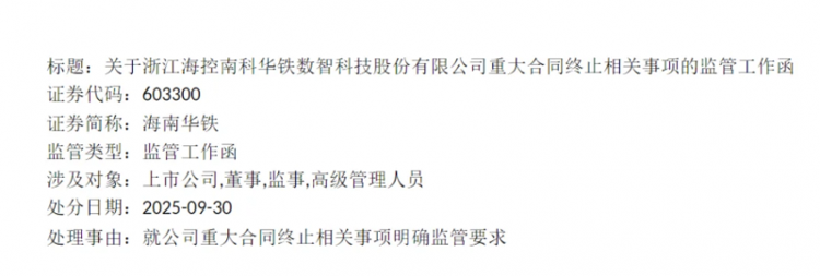 在公告发布同日,上海证券交易所对海南华铁下发监管工作函,就公司重大合同终止相关事项明确监管要求,涉及对象包括上市公司、董事、监事及高级管理人员。