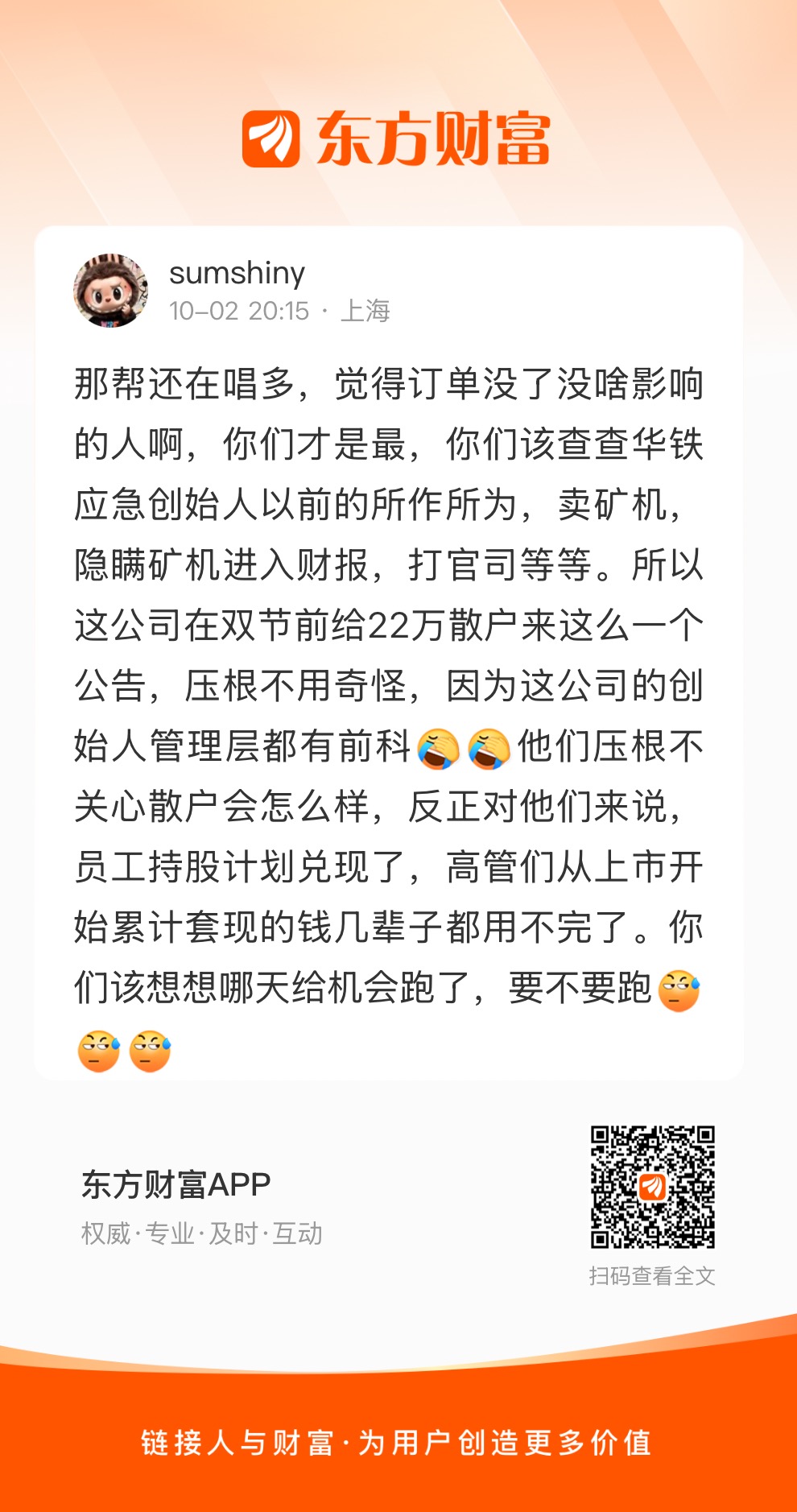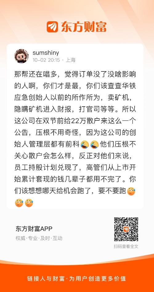 那帮还在唱多,觉得订单没了没啥影响的人啊,你们才是最,你们该查查华铁应急创始人以前的所作所为,卖矿机,隐瞒矿机进入财报,打官司等等。所以这公司在双节前给22万散户来这么一个公告,压根不用奇怪,因为这公司的创始人管理层都有前科