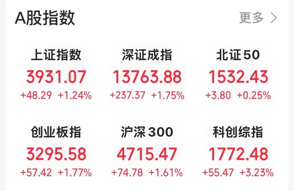 10月首个交易日,A股市场延续强势表现,沪指早盘持续冲高,时隔十年重返3900点关口。截至午间休市,上证指数报3931.07点,涨1.24%;深证成指、创业板指分别涨1.75%和1.77%;科创50指数半日大涨5.59%。