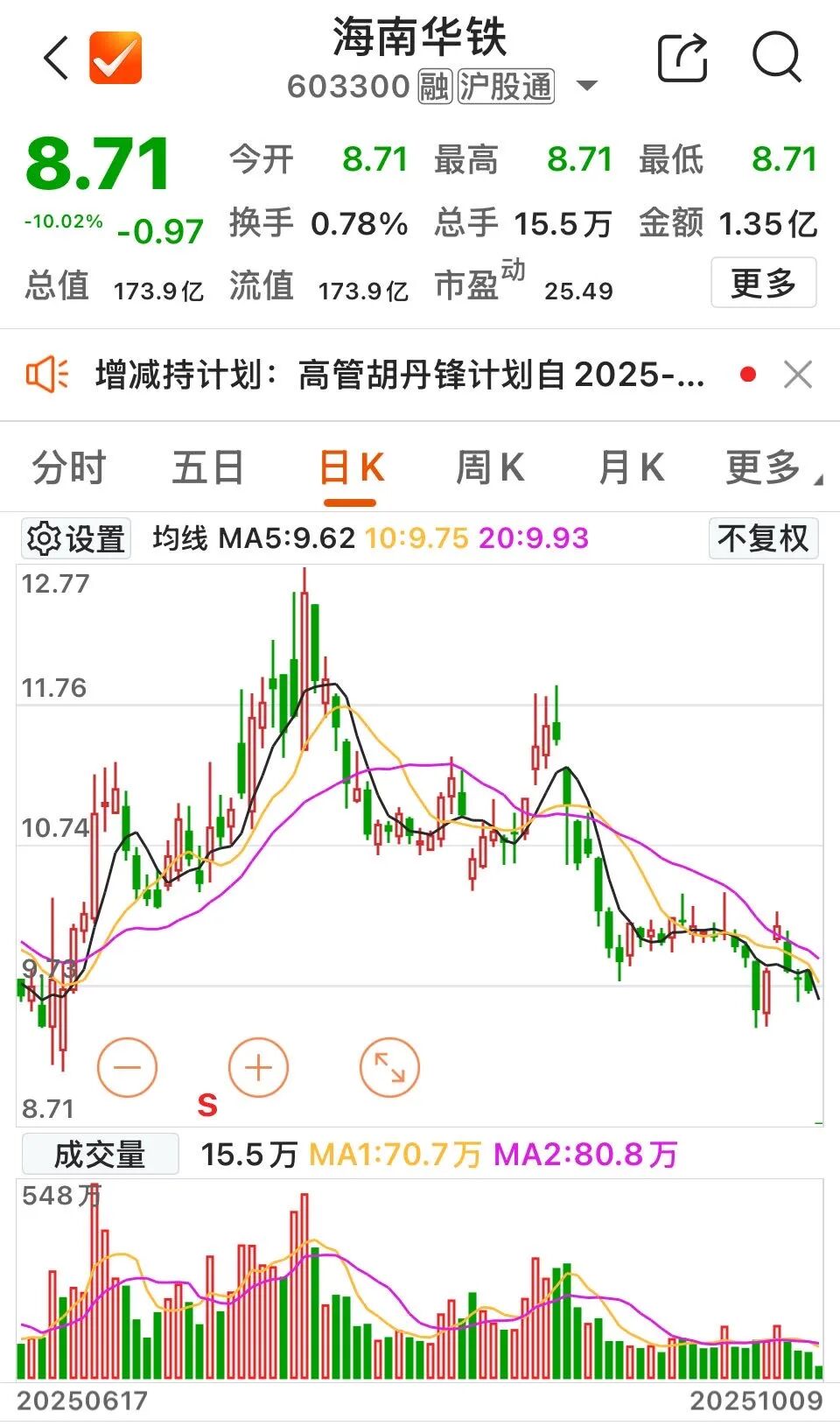 10月8日晚,海南华铁又披露公告称,持股5%以上股东胡丹锋决定终止减持计划,并计划在未来1个月内通过集中竞价方式增持公司股份,增持金额不低于3000万元且不超过5000万元。