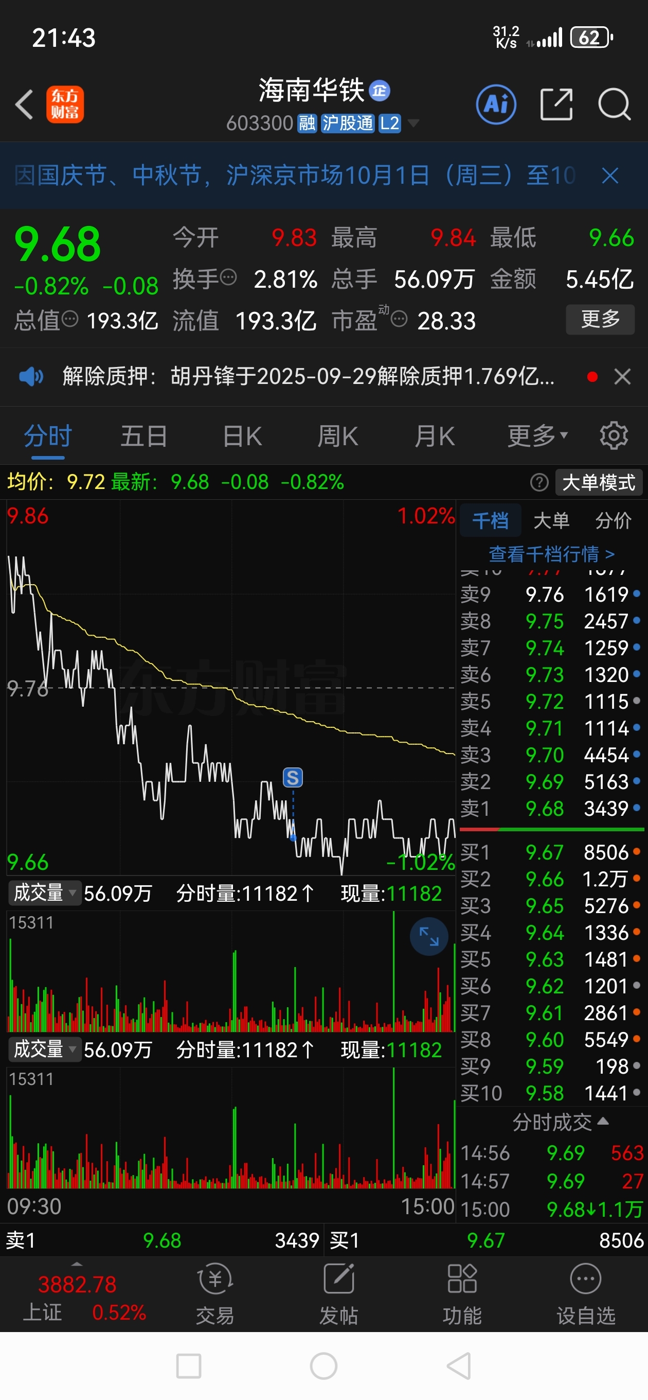 $海南华铁(SH603300)$ 还好上个交易日跑了 要不然明天…更惨。。。