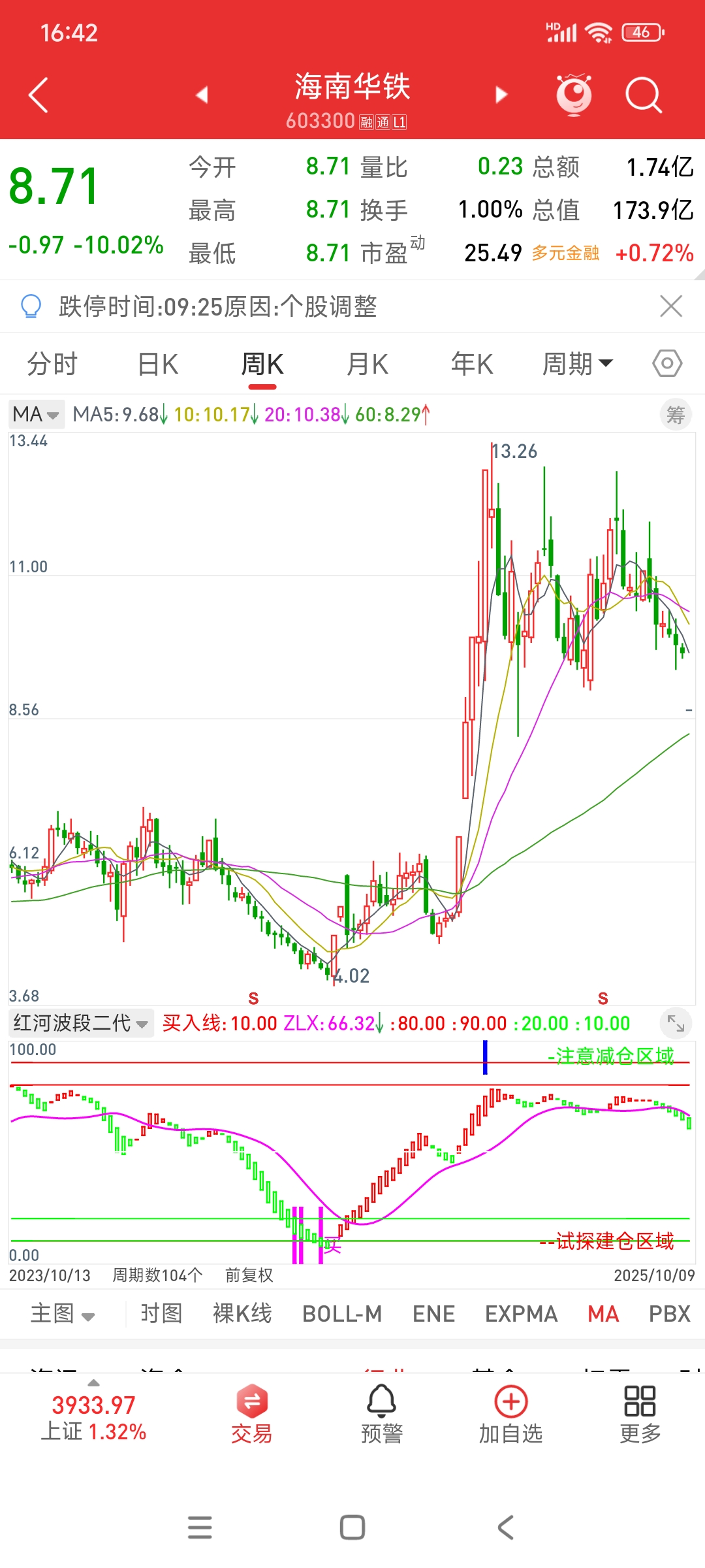 $海南华铁(SH603300)$ 周线级别早就是绿柱延续了,说明大方向就是看毕竟绿柱不停,下行不止,绿柱拉长,崩溃不止,继续