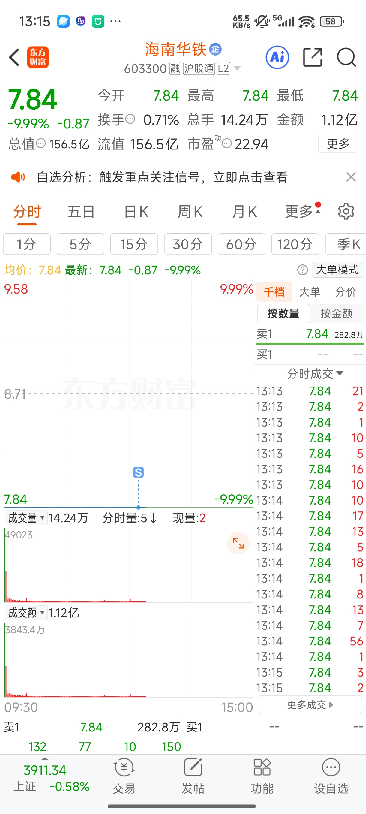 $海南华铁(SH603300)$ 居然跑出来了,不过只挂了一半,亏惨了,唉