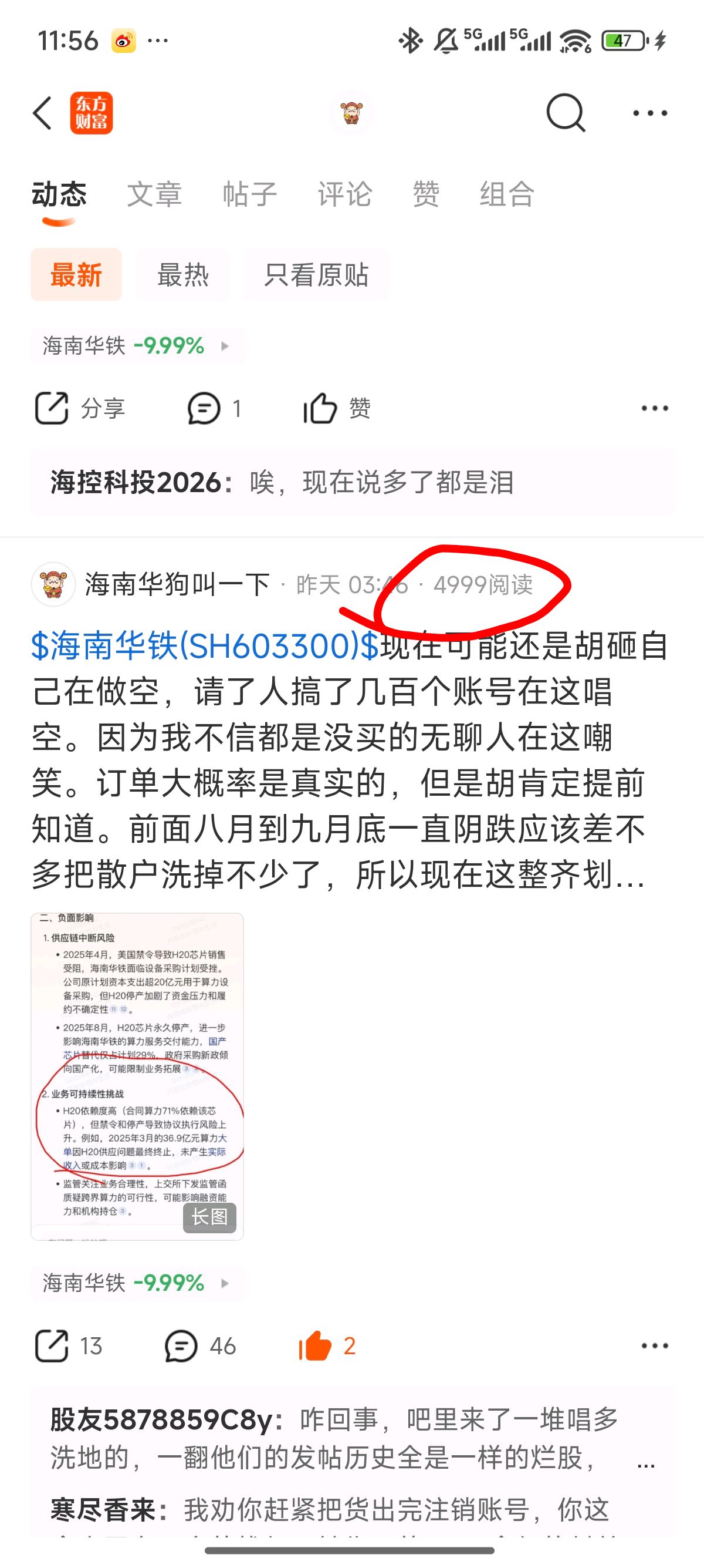 $海南华铁(SH603300)$ 现在可能还是胡砸自己在做空,请了人搞了几百个账号在这唱空。因为我不信都是没买的无聊人在这嘲笑。订单大概率是真实的,但是胡肯定提前知道。前面八月到九月底一直阴跌应该差不多把散户洗掉不少了,所以现在这整齐划一的两百多万砸盘的应该都是主力在砸,这主力还能是谁,只能是提前知道合同取消的胡砸方。砸到现在,目标一方面应该是为了洗盘做空,后面再重新买入。另外一方面是今天整个市场都在压价,迎接国某队的一万亿。