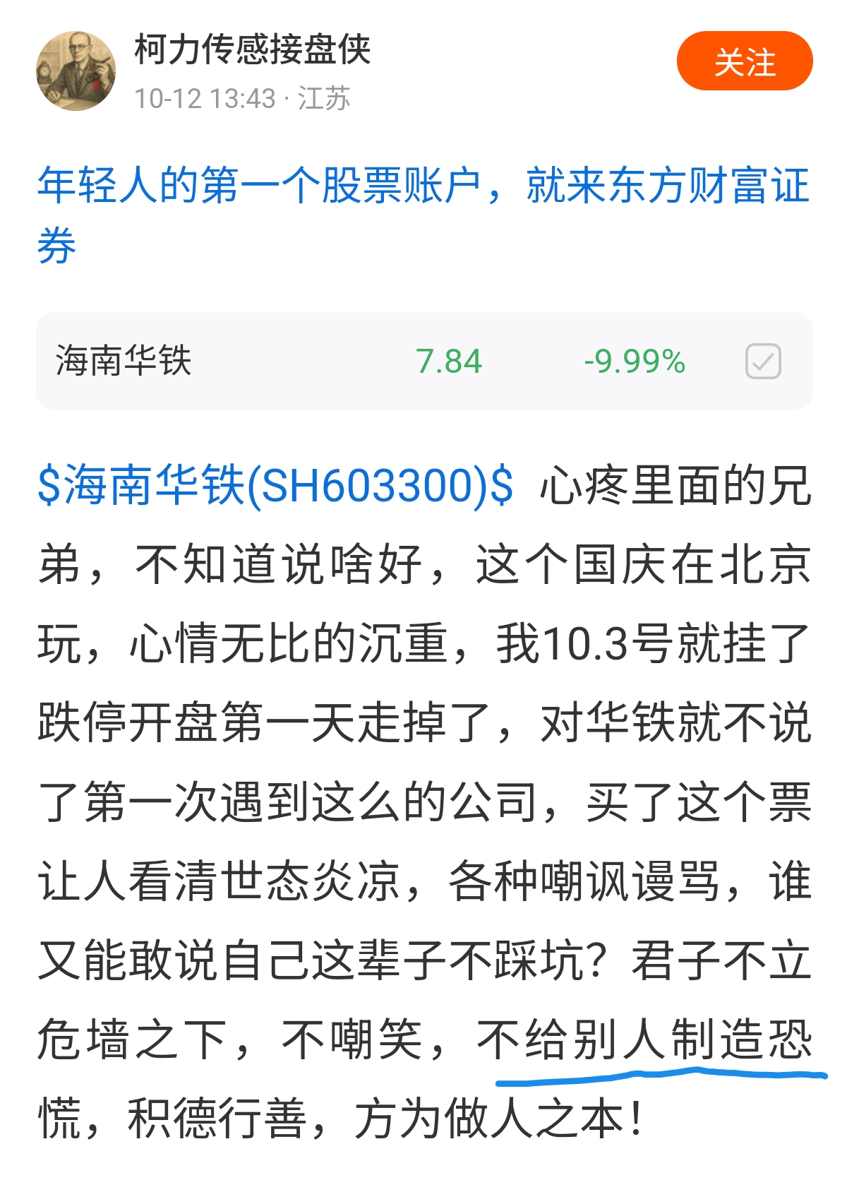 $海南华铁(SH603300)$ 有些人说过的每一句话都是为了让自己减少损失,压根就不是真的为你们着想!国庆此人的复读机模式,让很多散户错过最佳挂隔夜单跑出来的机会!