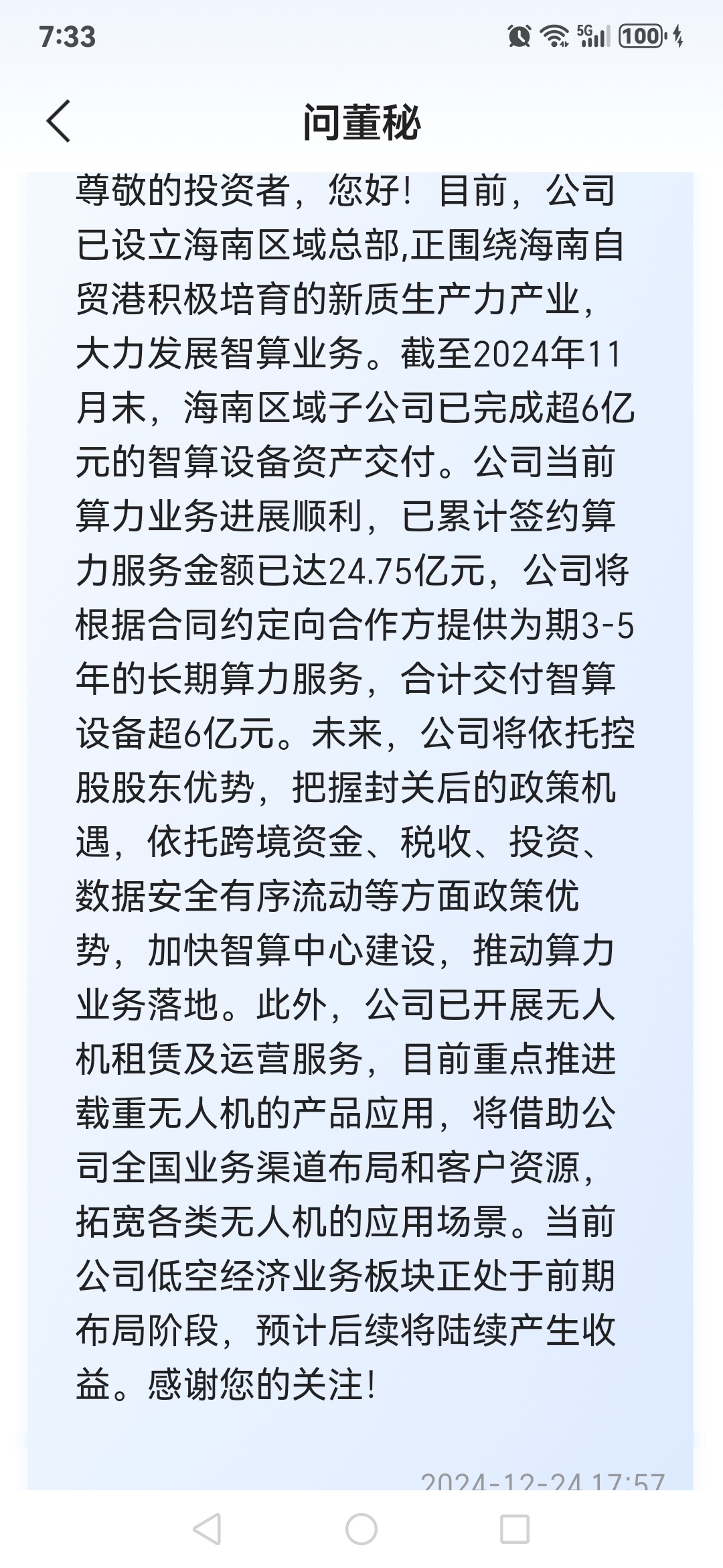 这是海南华铁去年12月24日董秘的回复,希望这个不要是假的!