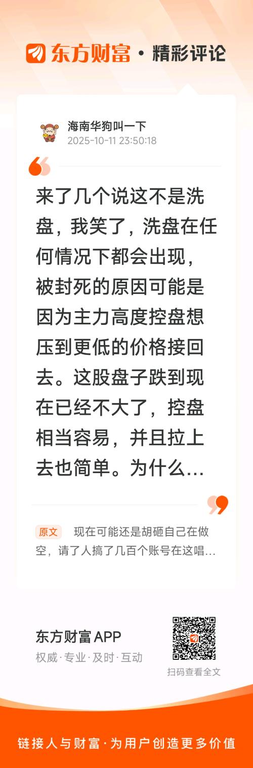 昨天已经说了,一波瞬间吃了16亿,打破主力的阴谋我高兴哈哈//@海南华狗叫一下 :来了几个说这不是洗盘,我笑了,洗盘在任何情况下都会出现,被封死的原因可能是因为主力高度控盘想压到更低的价格接回去。这股盘子跌到现在已经不大了,控盘相当容易,并且拉上去也简单。为什么曾经冲上人气榜第一名三天而且现在还是平均一分钟三条唱空贴子的股会没人接呢?根本不可能有那么多与之无关的好心人在这劝人吧?事出反常必有妖,大概率现在唱空的基本都是主力水军,目标是压到更低价后瞬间吃掉所有前面因为恐慌的挂单。ps:又差点被空头的水军小号刷下来了,重新顶上去