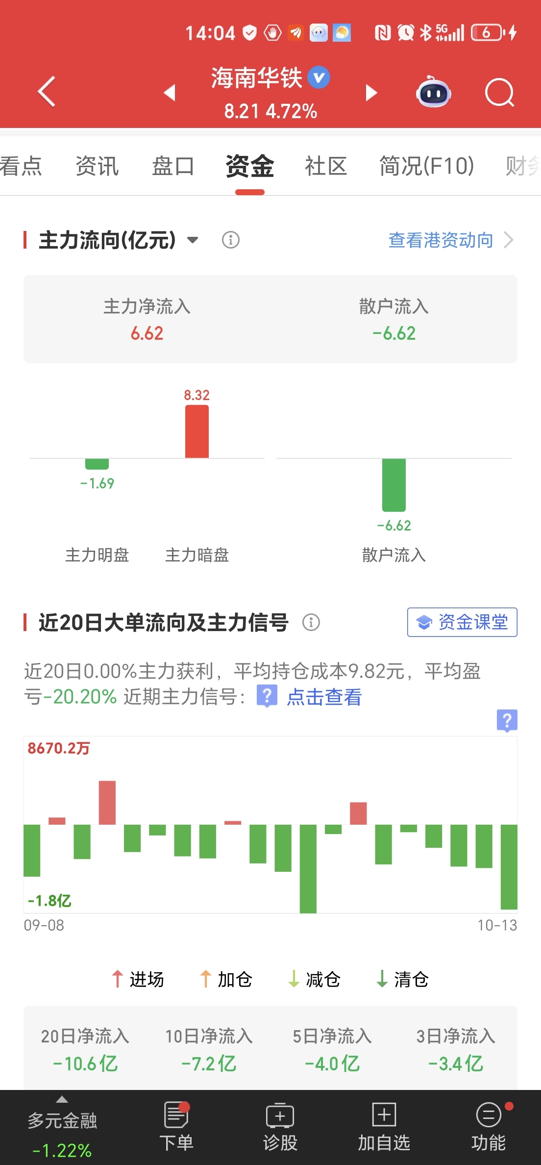 $海南华铁(SH603300)$ 主力暗盘流入6个多亿,怕什么