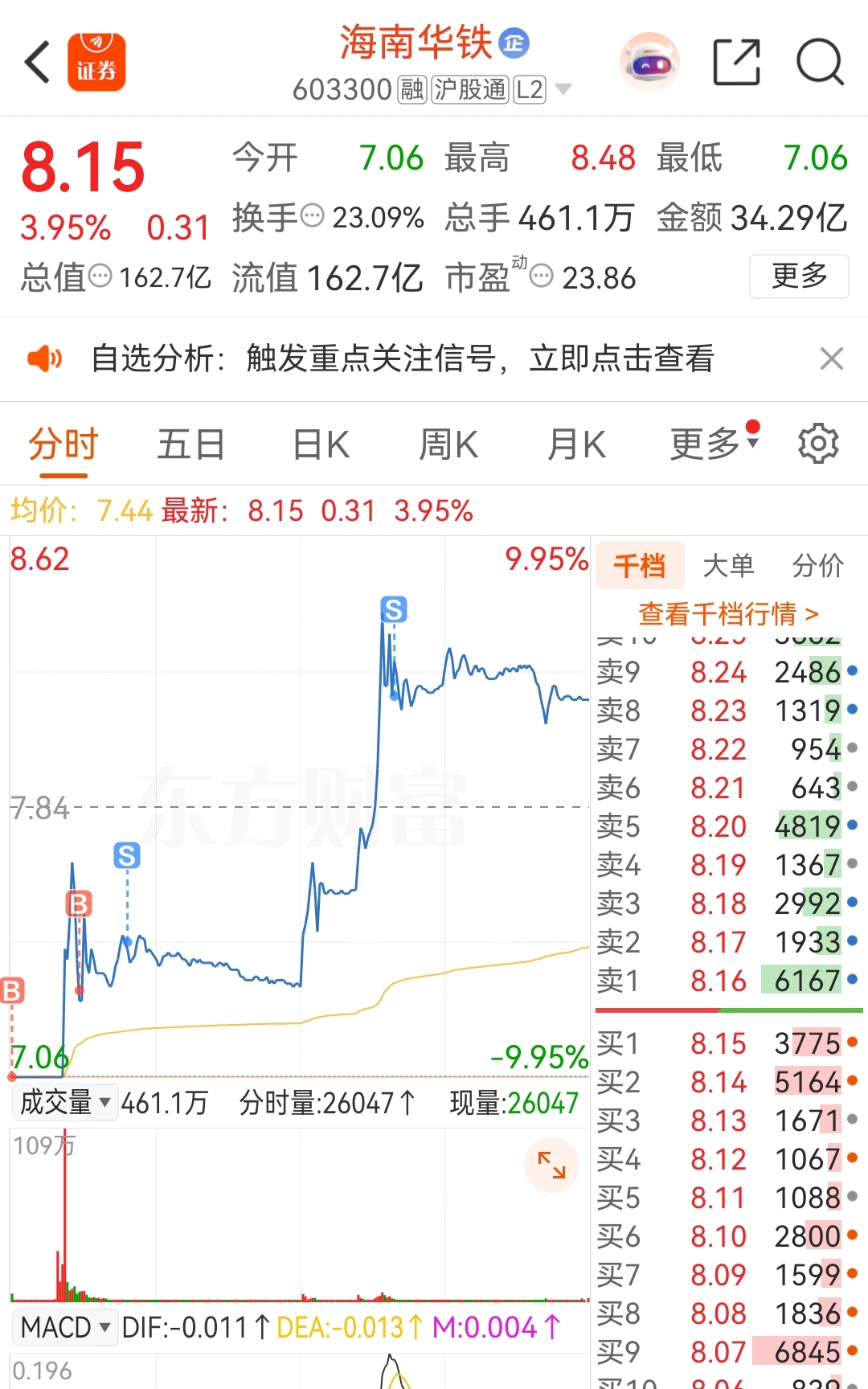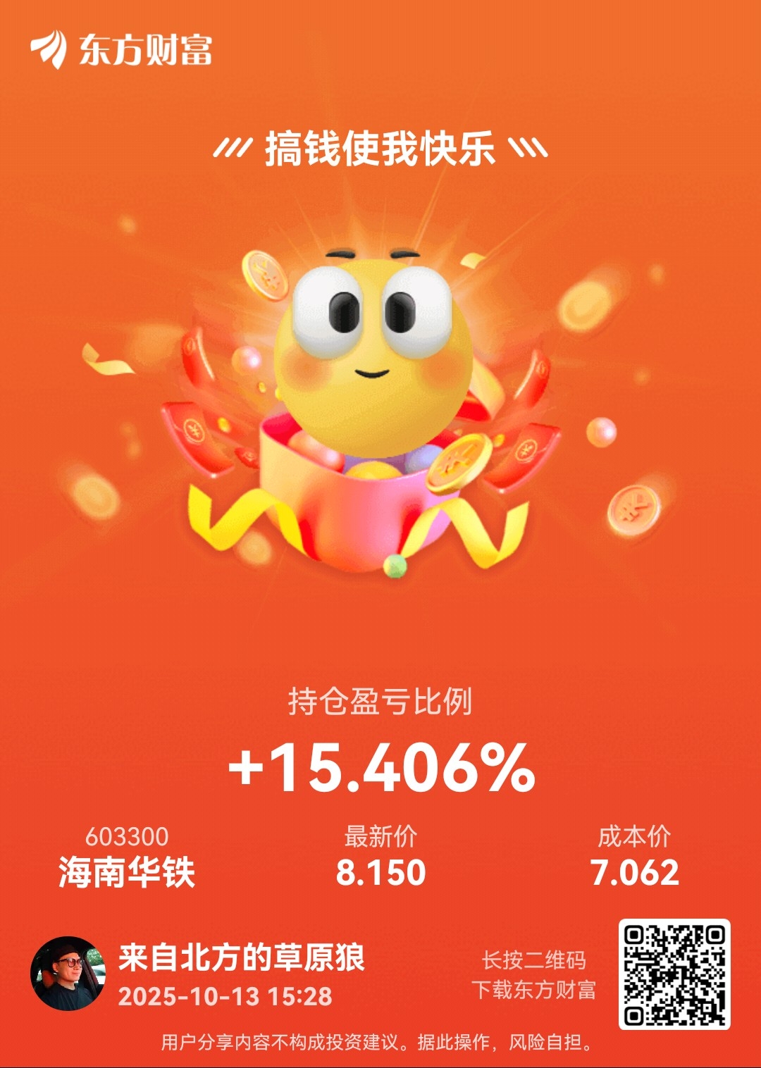 $海南华铁(SH603300)$ 预判了3个跌停,9:15的集合竞价,看到隔夜单只有40多万手,所以果断的报买入单,7.06抄底成功,中途加仓后发现走势偏弱,便把中途加的出了;下午增持利好冲高回落时,把早盘加的T出了;早盘的T收益16%还是很满意的;