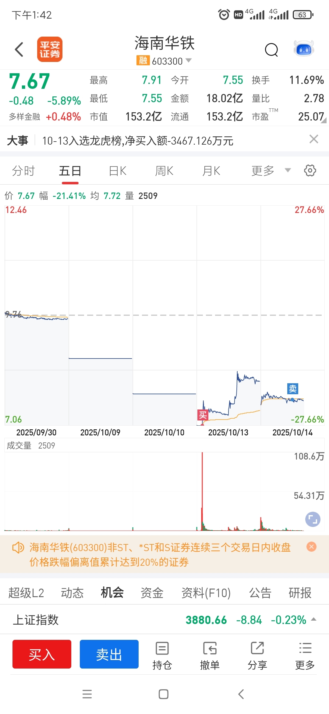 $海南华铁(SH603300)$ 今天割肉跑了!看机会再进来