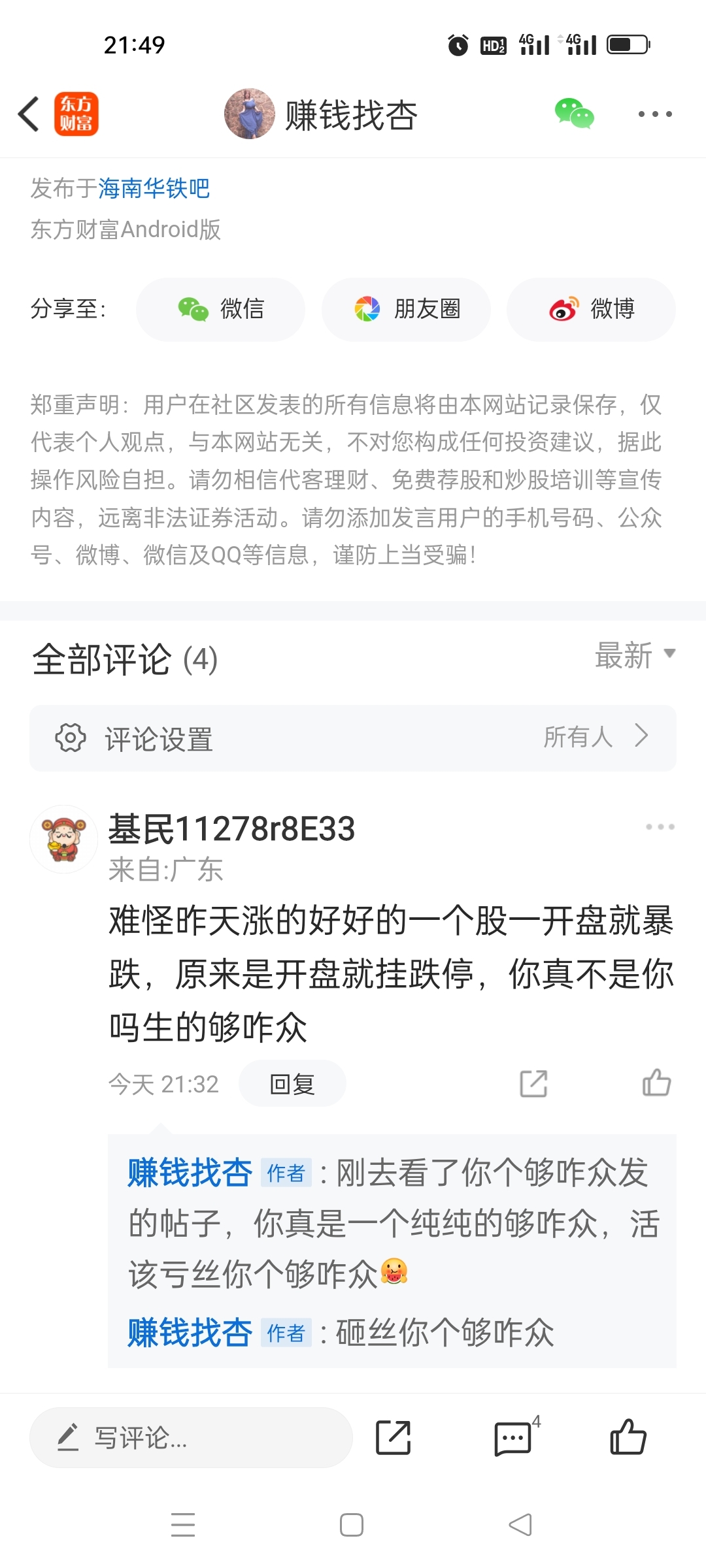 温馨提示: 1.根据《证券法》规定,禁止编造、传播虚假信息或者误导性信息,扰乱证券市场;2.用户在本社区发表的所有资料、言论等仅代表个人观点,与本网站立场无关,不对您构成任何投资建议。用户应基于自己的独立判断,自行决定证券投资并承担相应风险。《东方财富社区管理规定》