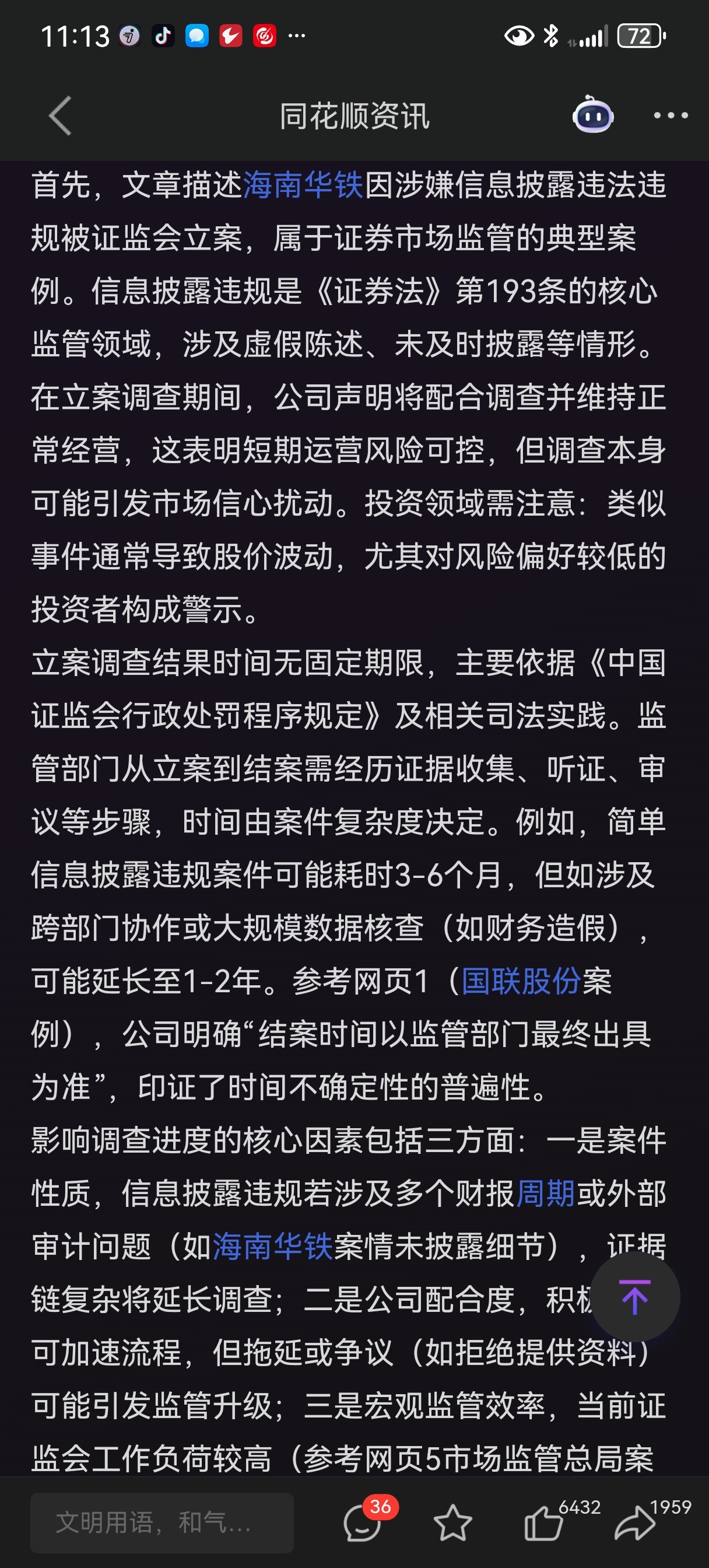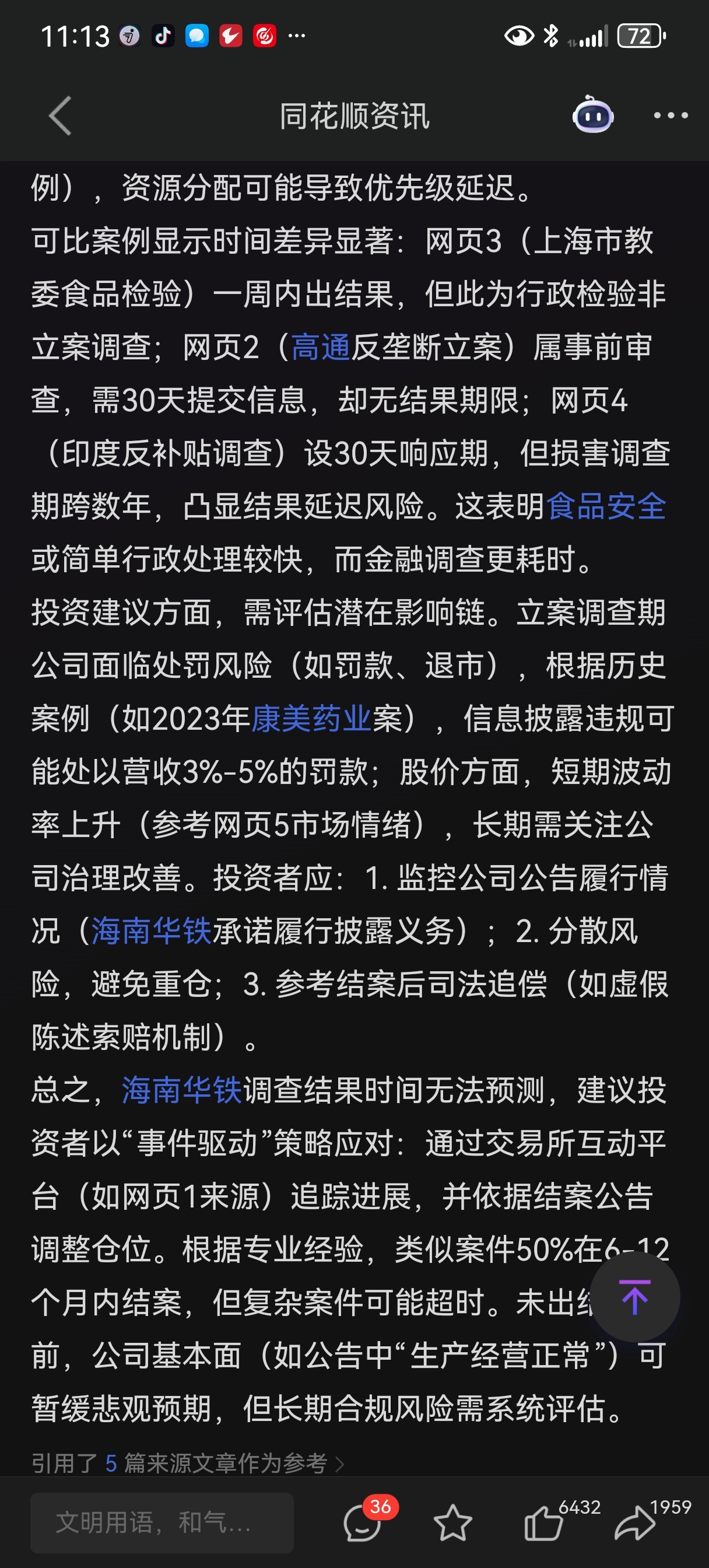 $海南华铁(SH603300)$ 从调查到出结果得三到六个月,就算调查出问题,又不会退市。怕什么,又不是财务造假,你看你们怕什么,第二,现在又不是高位。跌下来,人家大股东才增持完毕。说明业绩不错。,第二海南马上封关了,多少有点利好吧,