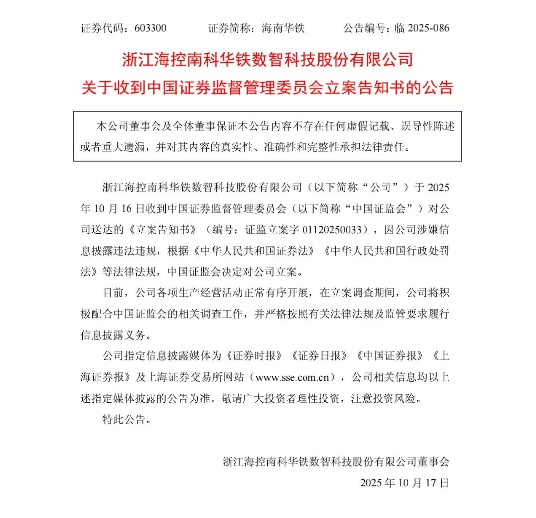 10月16日晚,海南华铁公告,公司于2025年10月16日收到中国证监会的《立案告知书》,因涉嫌信息披露违法违规,中国证监会决定对公司立案。目前,公司各项生产经营活动正常有序开展,将积极配合中国证监会的调查工作,并严格履行信息披露义务。
