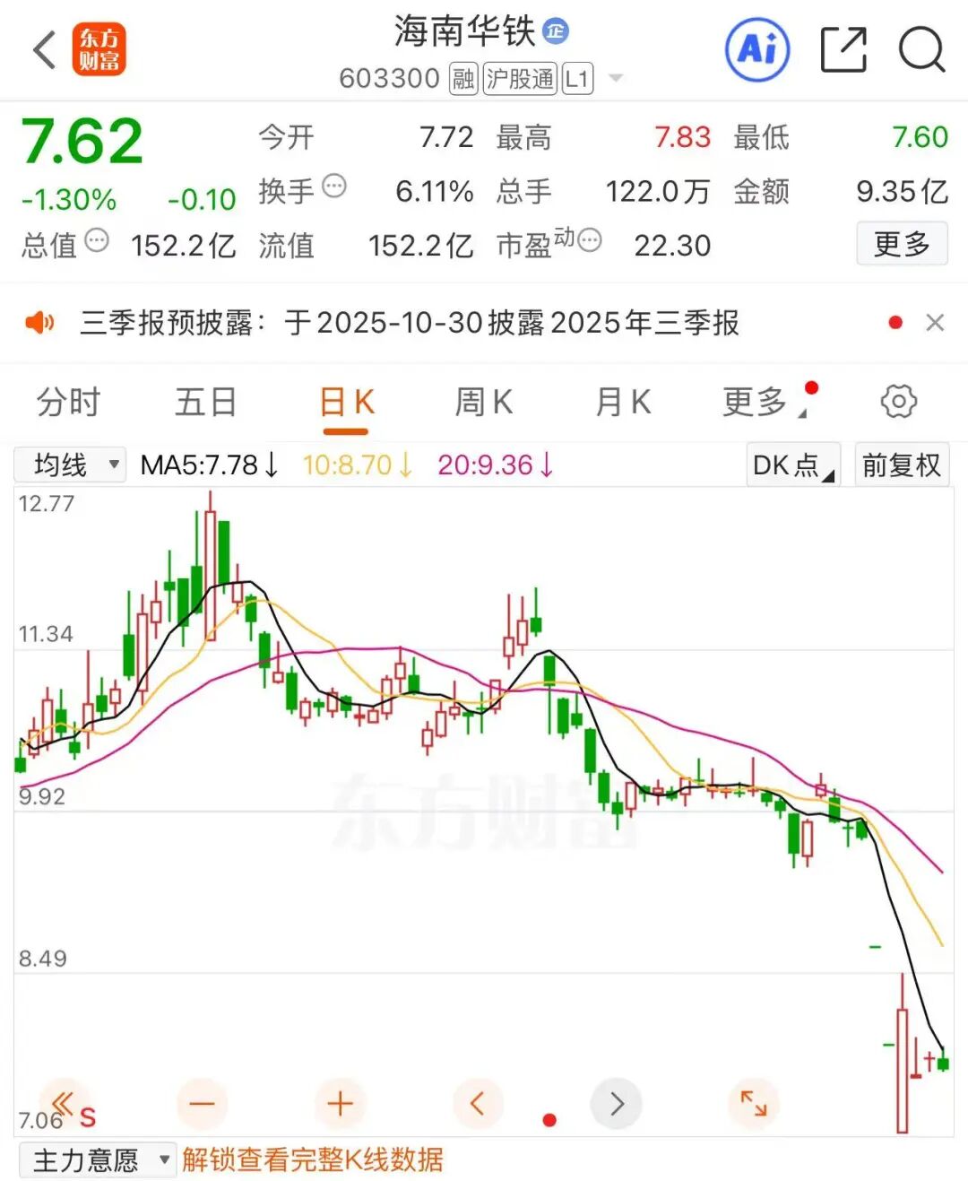 10月16日,海南华铁收跌1.3%,报7.62元/股。