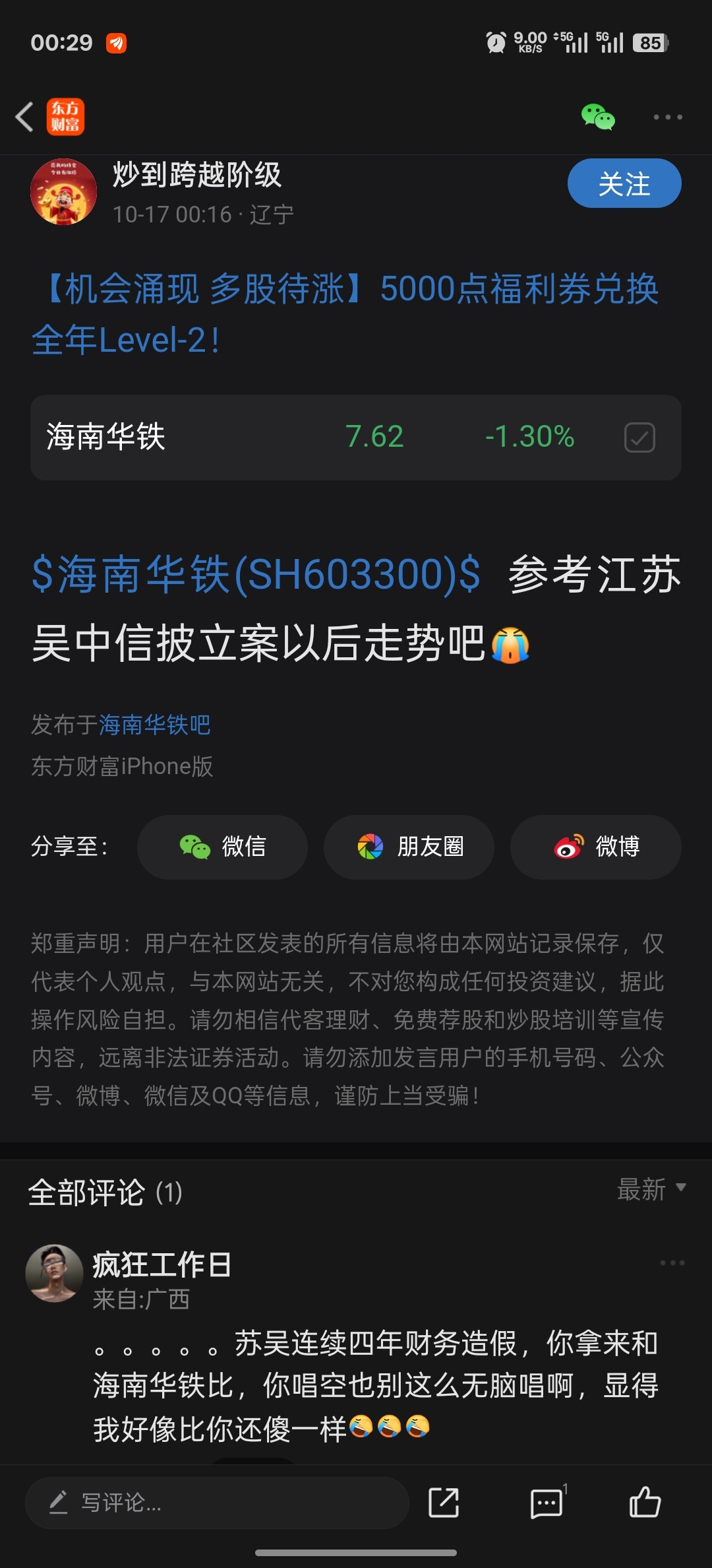 别老拿其他退市股和海南华铁比海南华铁这是独一份,没有参考情况,所以大家唱空别无脑唱,你唱个具体情况行不行,最后说一句:恐慌真没必要,真恐慌了就说明不适合炒股,这是最小的问题,就是一个信息披露问题,信息透露了而已。