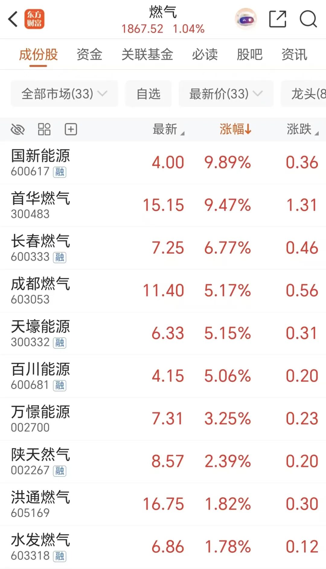 防御属性较强的燃气、煤炭等资源股周五逆市上扬,截至收盘,大有能源、国新能源、安泰集团等涨停,首华燃气涨超9%,长春燃气、成都燃气等涨超5%。