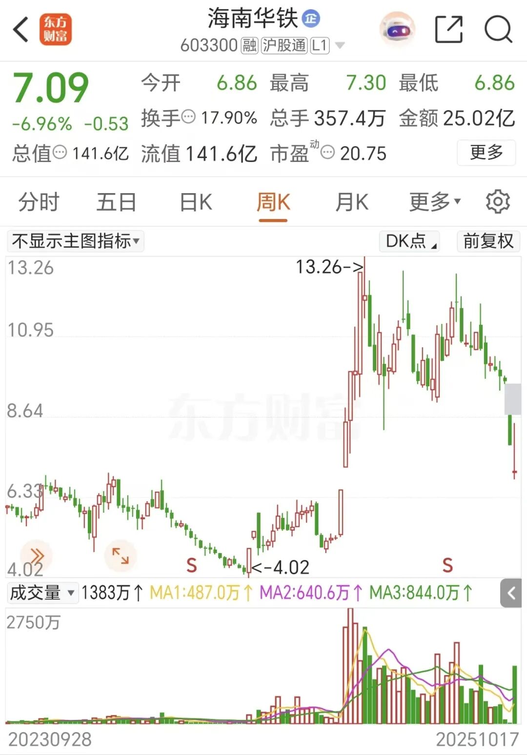 国庆假期后,受大订单告吹影响,海南华铁股价连续两天跌停,公司前实控人、第二大股东胡丹锋在压力之下宣布终止减持计划,并计划增持公司股份,随后公司控股股东海控产投也同步实施增持,试图稳定股价。但从市场反馈来看并不理想,10月以来公司股价累计跌幅已经接近27%。截至2025年6月30日,海南华铁最新股东户数超22万户。