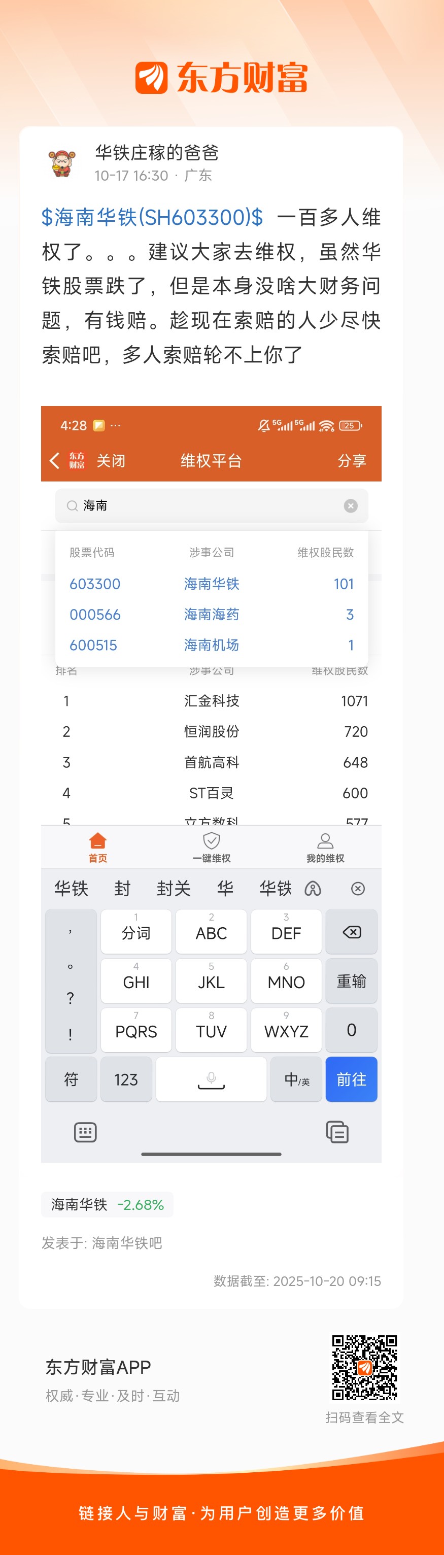 $海南华铁(SH603300)$ 一百多人维权了。。。建议大家去维权,虽然华铁股票跌了,但是本身没啥大财务问题,有钱赔。趁现在索赔的人少尽快索赔吧,多人索赔轮不上你了