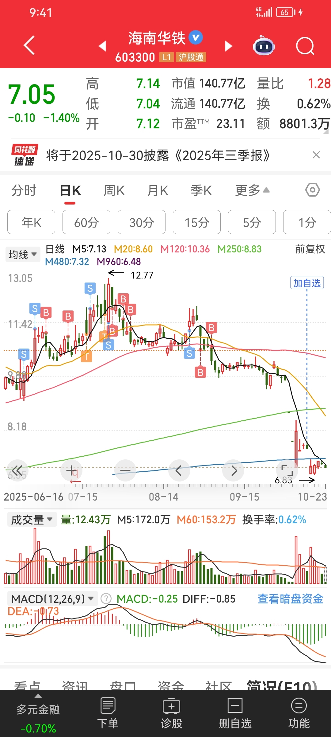 $海南华铁(SH603300)$ 在7.06元买了3000股,之前在10.58元买了1400股,三个跌停后在7.06元买入3000股,摊低成本到8.14元的成本4400股,480天均线的价格是7.22元,930天均线的价格是6.48元,未来如果macd指标金叉一次就可以考虑加仓400股
