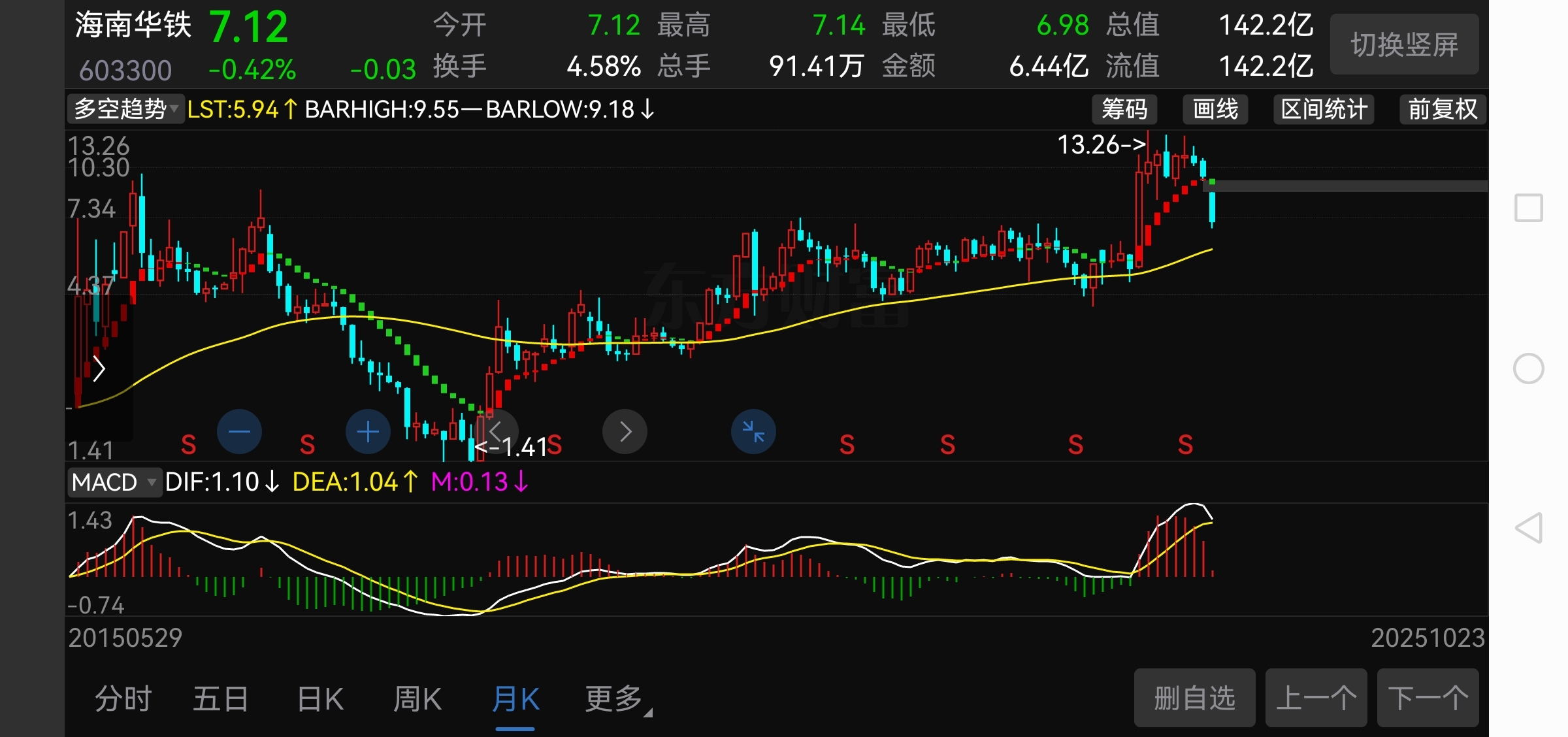 $海南华铁(SH603300)$ 从1.41开启的上涨周期到13.26结束!开始下跌周期,没个3,5年不见底。
