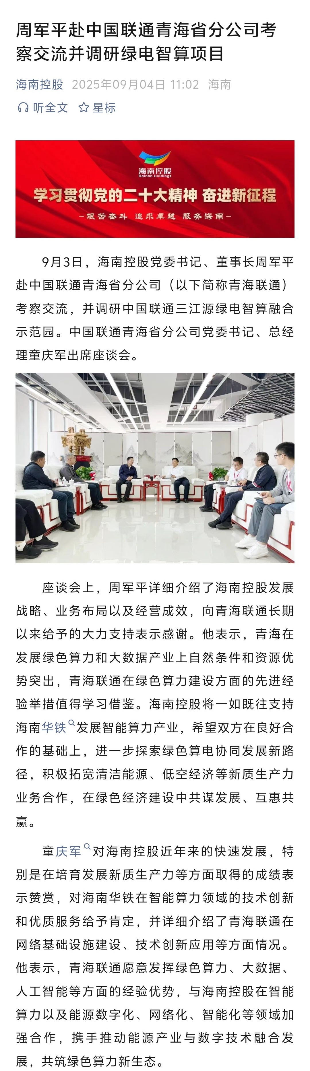 $海南华铁(SH603300)$ 图片来源海南控股公众号,海南控股将一如既往支持华铁开展算力业务