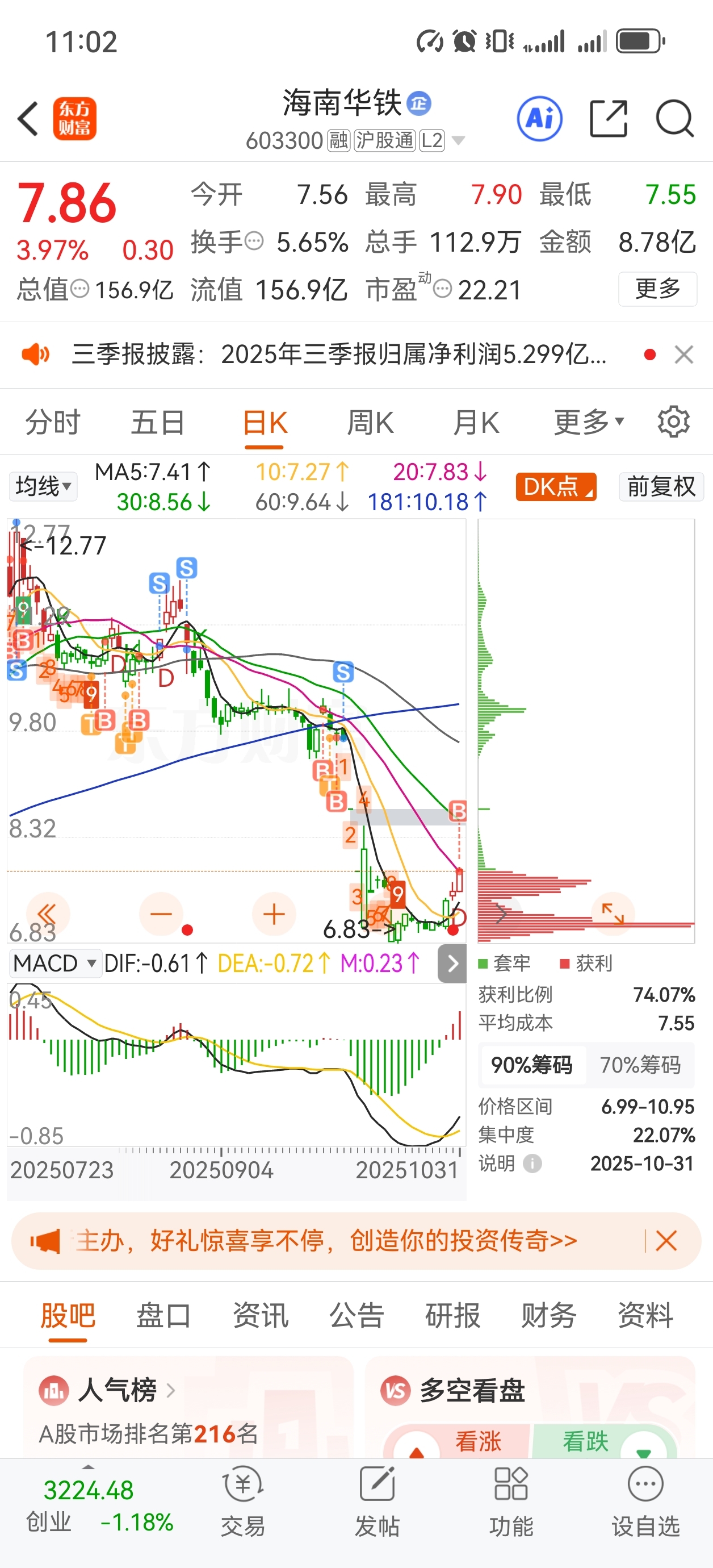 $海南华铁(SH603300)$ 我又来啦,784打个底仓,看图形走的挺好的,拐头了,底部特征明显,合同取消不怕,有业绩,又不会退市